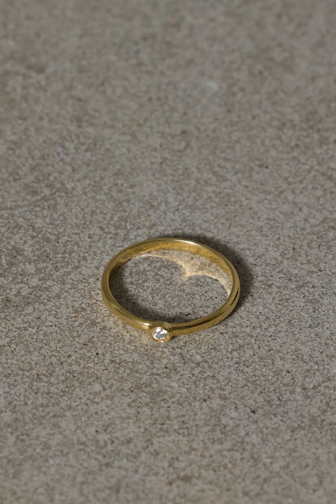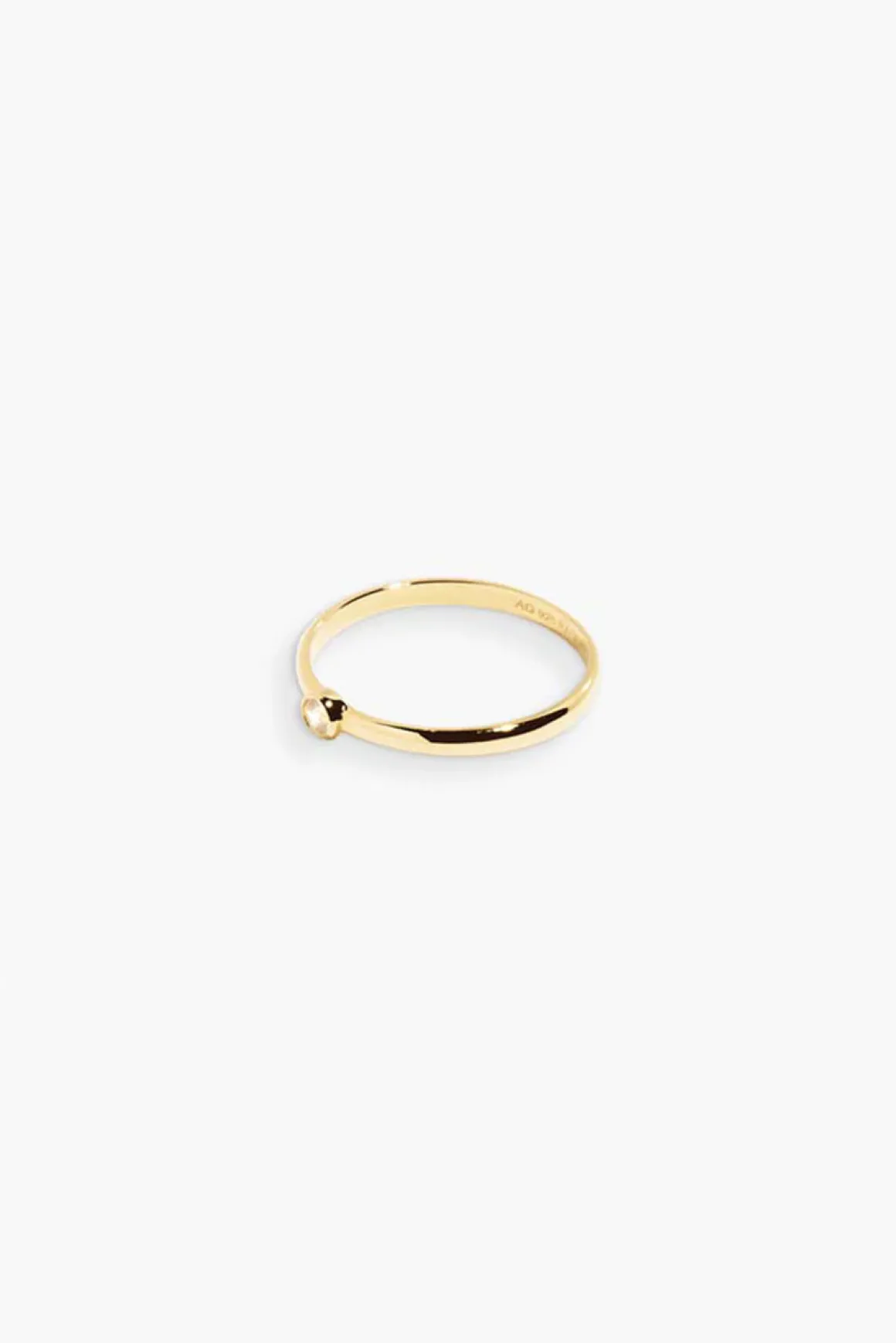 Odette mini ring fra Ragbag. Odette-ringen er laget av gullbelagt sterling sølv, med en glittrende, hvit cubic zirconia-stein. Perfekt for deg som ønsker noe enkelt, men som samtidig skiller seg ut! RAGBAG Studio forener tradisjonelt håndverk og moderne design for å skape smykker som dette, inspirert av kunst og arkitektur, ideelle både til hverdags og spesielle anledninger. Brukes som tippring eller som vanlig ring.