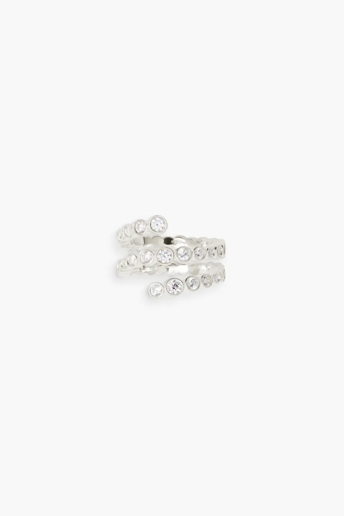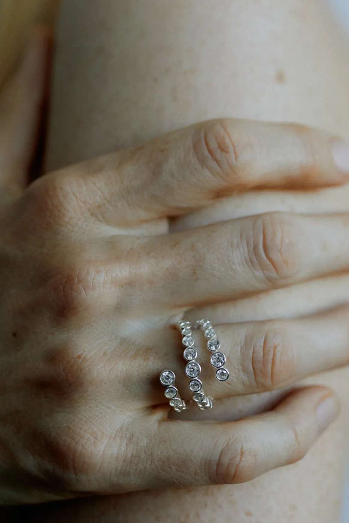 Odette ring fra Ragbag. Odette er en spiralring som snor seg rundt fingeren, pyntet med glitrende steiner i ulike størrelser. Ringen er laget av 925 sterlingsølv, og spiraldesignet skaper en følelse av bevegelse, som om ringen danser rundt fingeren. Odette balanserer et feminint preg med et organisk design, perfekt for deg som ønsker et smykke med karakter og personlighet.