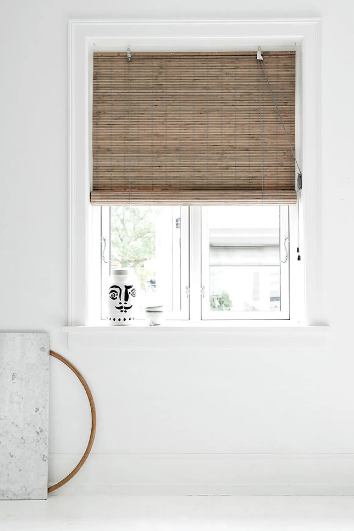 Skap lun stemning i hjemmet med rullegardiner i Gråbeiset Lysdempende Bambus fra danske Color u0026amp; Co. En vakker gardin som består av bambuslameller på ca. 0,7 cm som er vevd sammen på en overlappende måte som gir gardinen svært god solskjerming. Passer perfekt i rom som trenger god demping av sollys eller innsyn, som f.eks tv-stuen eller soverommet. Siden det er er litt avstand mellom karmen og rullegardinen, vil rullegardinen aldri være 100% lystett. Rullegardinen er beiset i samme farge som modellen Gråbeiset bambus (75% solskjerming), så disse gardinene passer perfekt hvis du vil ha samme design i hele huset. Denne modellen kommer med trådtrekk, men kan også spesialbestilles med kjedetrekk. Merk at bambus er et naturmateriale og kan variere noe i farge.