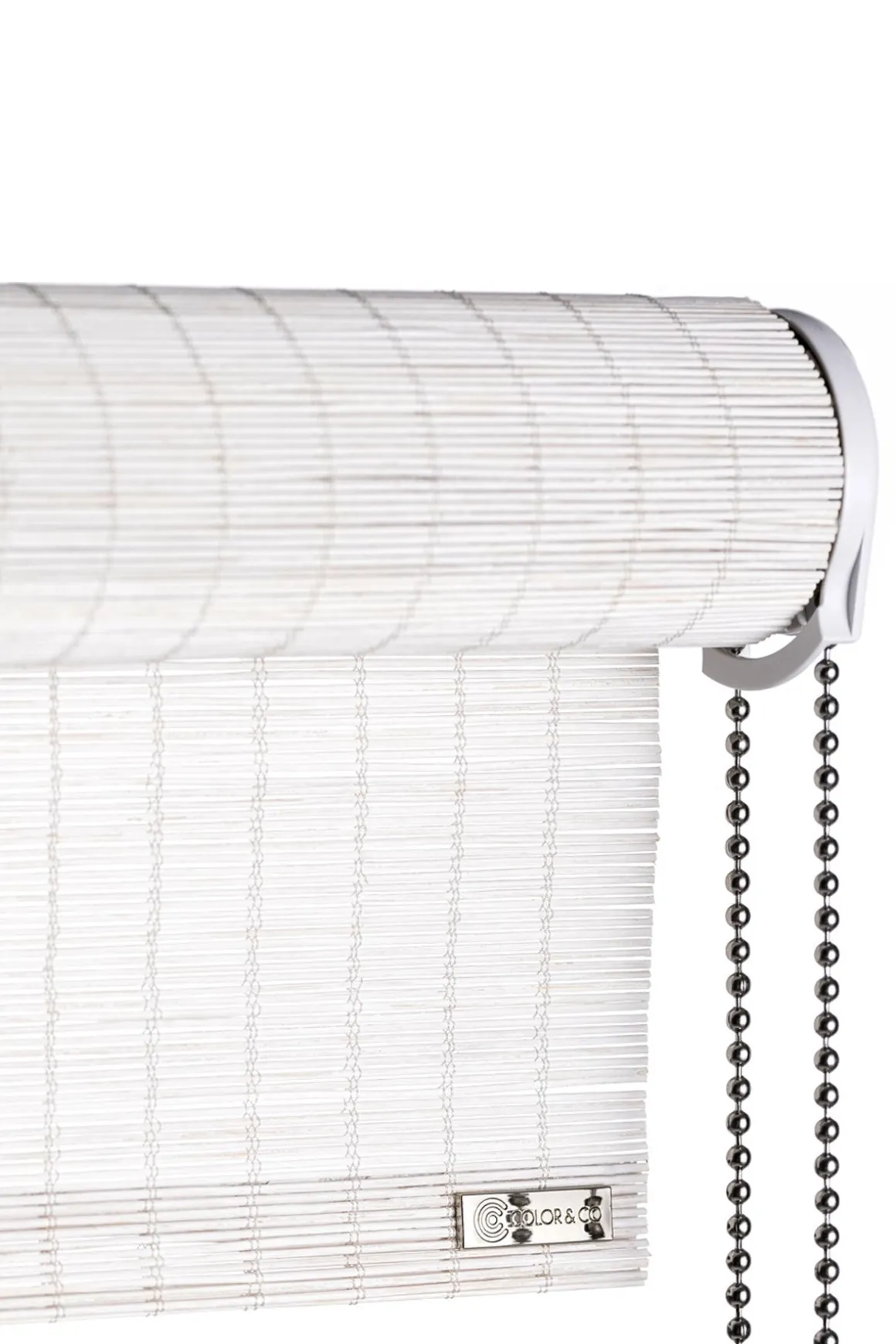 Bambus rullegardin fra danske Color u0026amp; Co i en nydelig hvitbeiset farge. En vakker gardin som består av fine og runde bambuspinner på ca. 1 mm, som er vevd sammen med hvit tråd. Denne gardinen finnes nå kun som spesialmål og ikke i standardstørrelser lenger. Utvalget og prisene er basert på de mest populære størrelsene, men du kan få kappet gardinen i eksakt høyde og bredde til dine behov. Er du usikker, så ta kontakt med oss så hjelper vi deg gjerne! Produksjonstid for spesiallagde rullegardiner er ca. 3 uker.
