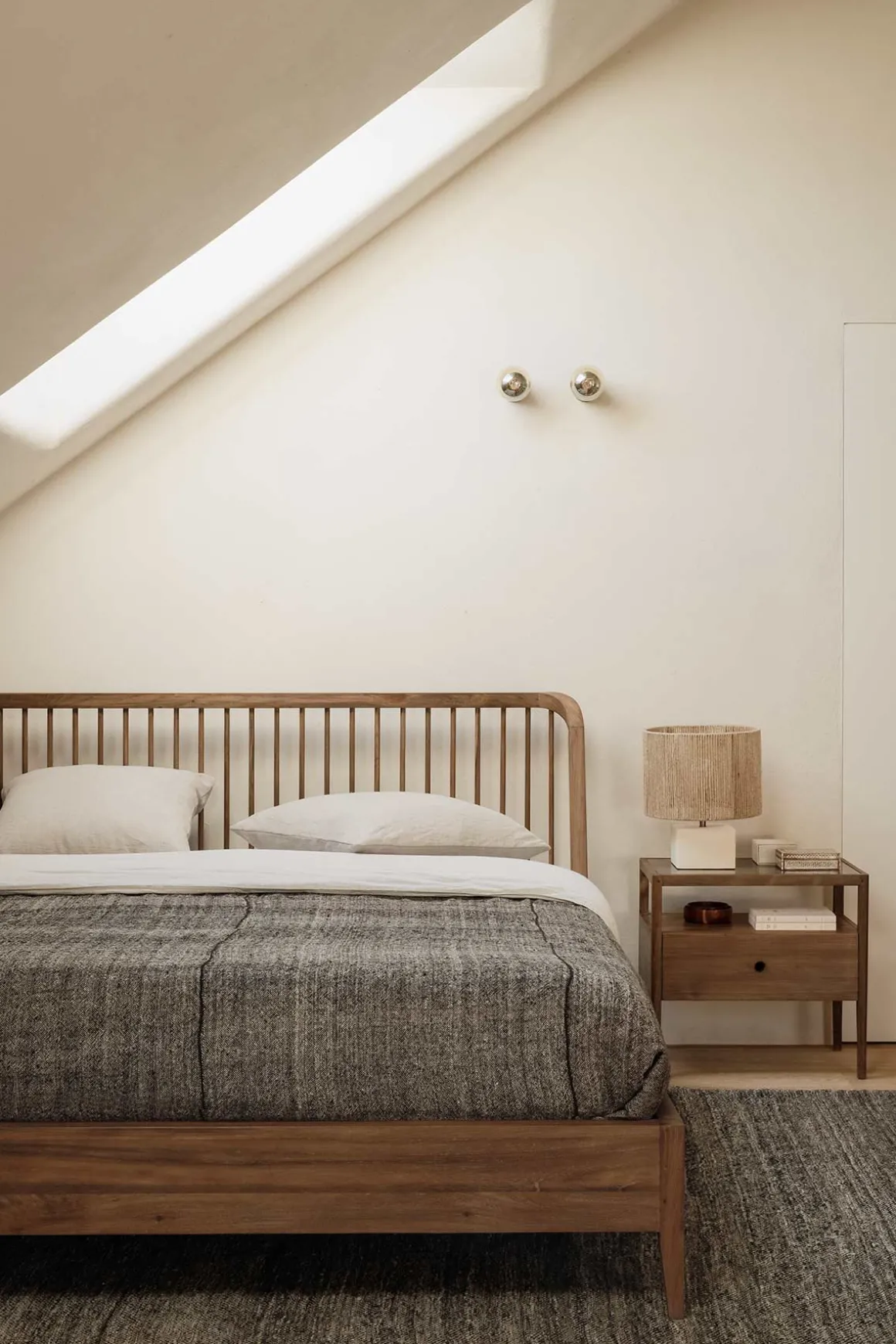 Spindle dobbeltseng fra belgiske Ethnicraft. Spindle-kolleksjonen er inspirert av tradisjonelle spinnehjul, med perfekt justerte eiker i sengegavlen. Lett avsmalnende ben og avrundede kanter gir en myk, sensuell kvalitet til denne vakre soveromskolleksjonen. Sengen er laget i solid, gjenvunnet FSC teak og er et stødig møbel som vil tåle tidens tann. Merk at treverket vil variere fra møbel til møbel og ingen vil være like. En klassisk, men slående seng uansett om du velger å ha den hjemme eller på hytta. Sengen passer med standard madrass i størrelse 160×200 cm. Sengen kan også bestilles i oljet eller sort eik og i større størrelse (180x200cm).