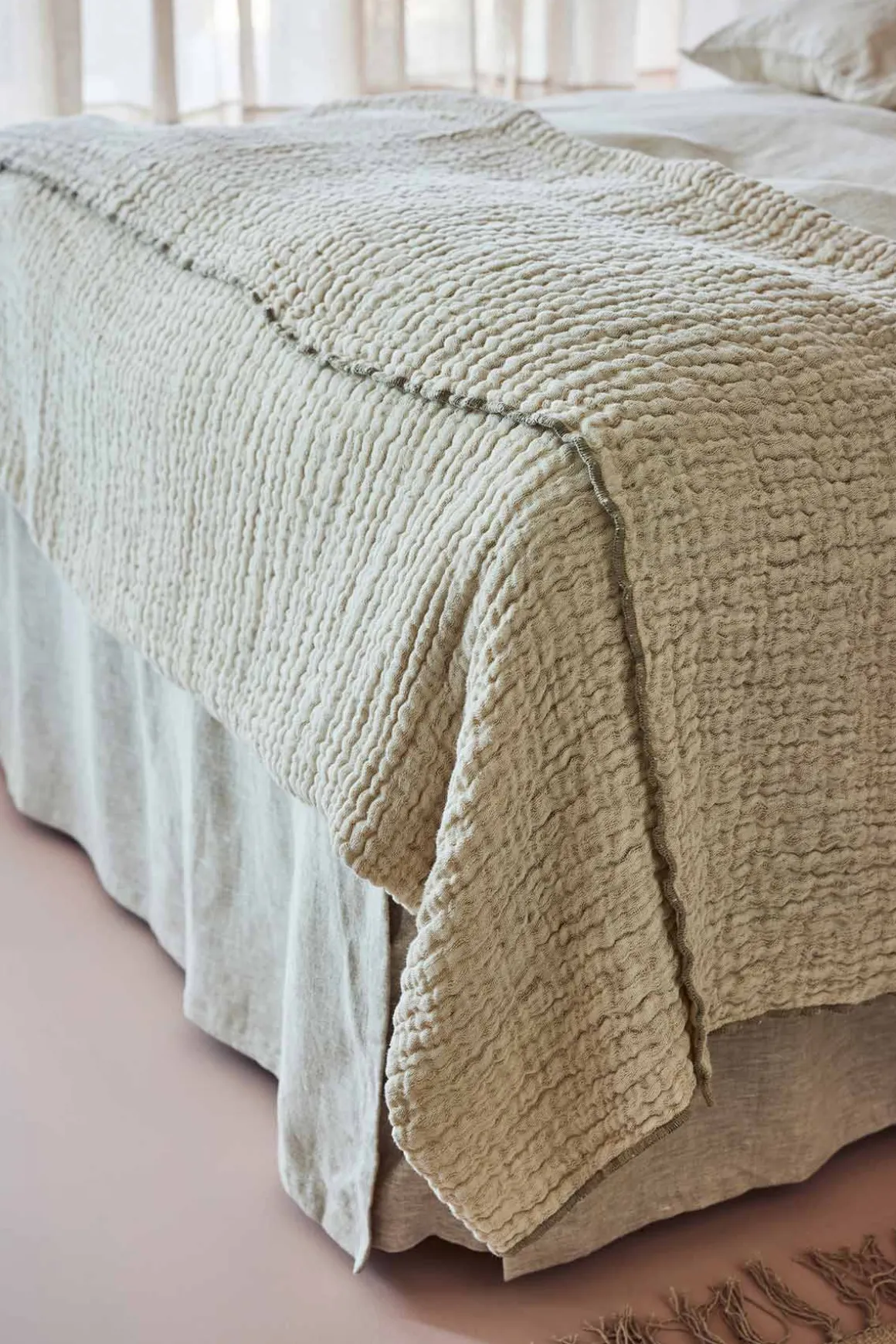Pauline sengeteppe i fargen Oatmeal fra Himla er laget av en dobbeltvevd bomulls-og linblanding med en myk, krøllet overflate. Overlocksøm i en kontrastfarge langs kantene skaper et mer spennende uttrykk. Sengeteppet har ulik for- og bakside og er også vendbart for de som ønsker det. Veldig pent og superherlig i sengen på kjølige netter.