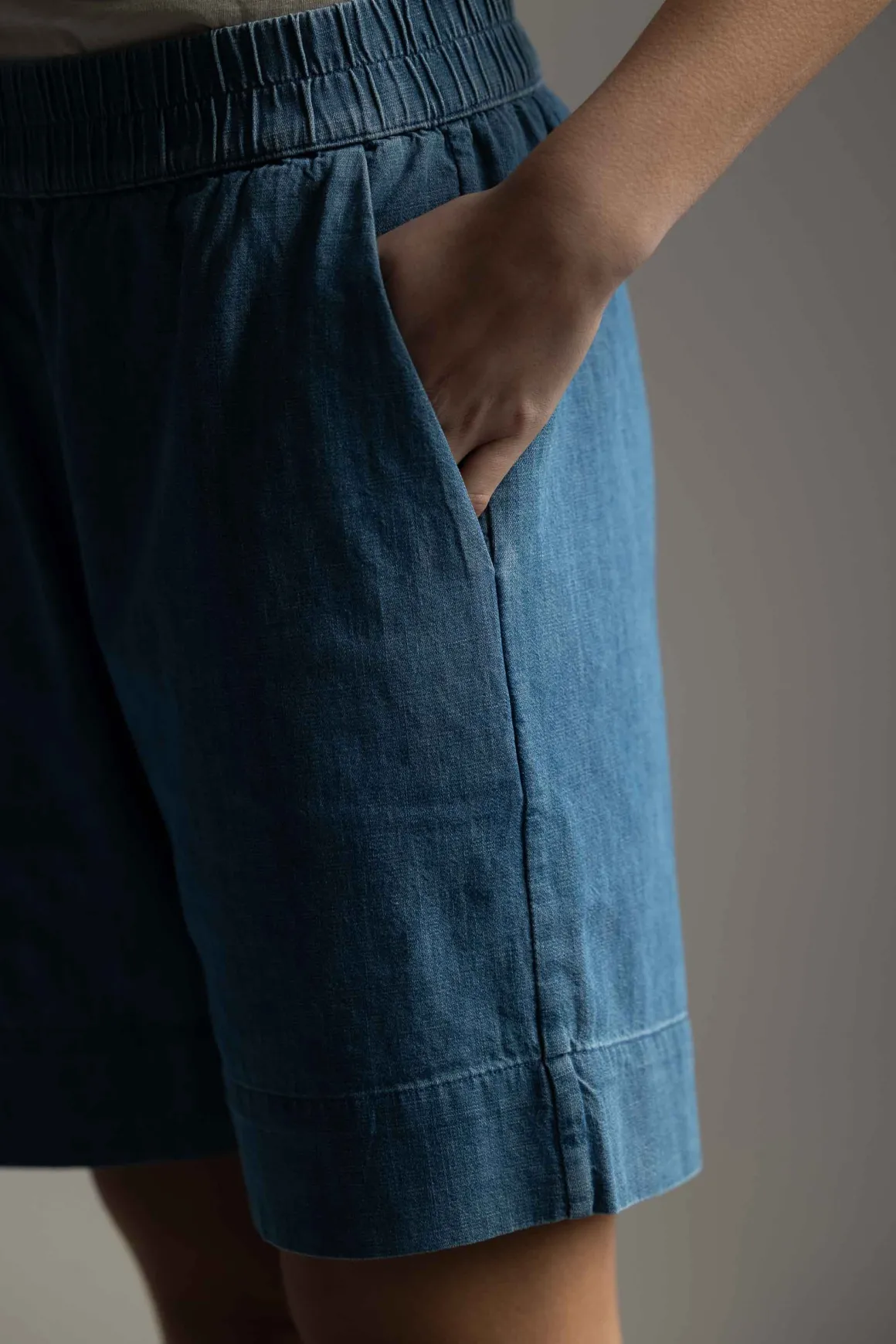 Denne denimshortsen fra Aiayu kombinerer komfort og stil med en avslappet passform og Bermuda-inspirert lengde. Laget i myk, økologisk bomull, har shortsen elastisk midje, skrå lommer og en bred kant nederst. Et allsidig plagg som enkelt kan styles til både hverdags og sommerlige anledninger. Kombiner med Lynette denimskjorte for et komplett sett.