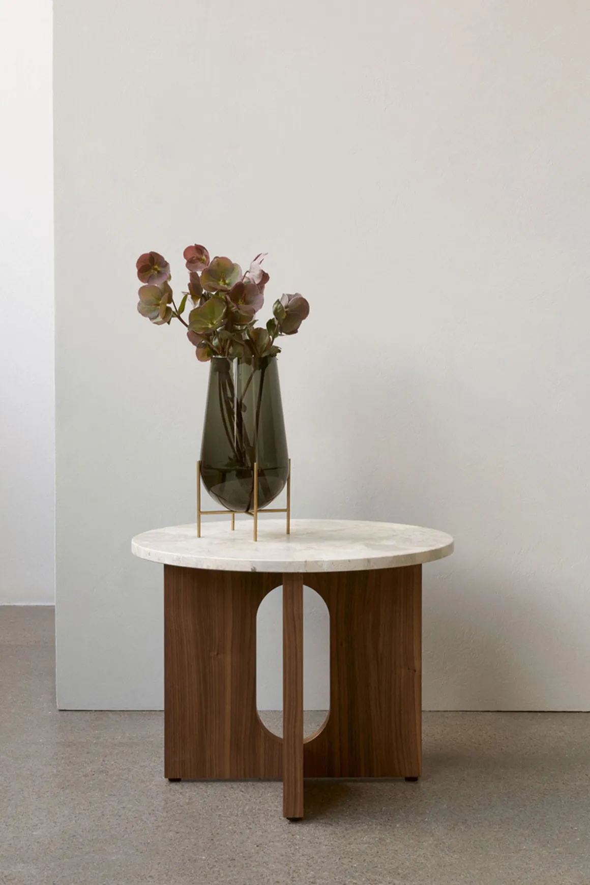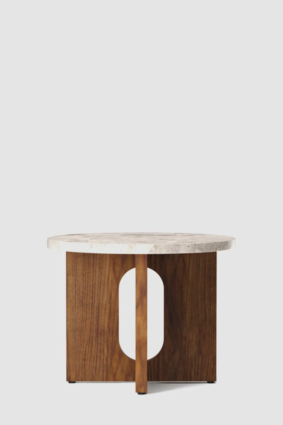 Androgyne Side Table, designet av den norske arkitekten og designeren Danielle Siggerud. Et perfekt proporsjonert sidebord med en spennende kombinasjon av maskuline og feminine elementer, med sterke kontraster mellom stein og tre. Kunis breccia-stein er kjent for sine karakteristiske årer og mineral-fragmenter i en varm beigetone. Bruk bordet som et mindre stuebord, eller som sidebord til planter, bøker og levende lys. Bordet finnes i flere varianter; understell i naturlig eik, mørkbeiset eik eller valnøtt. Bordplaten kan også bestilles i heltre istedenfor stein.