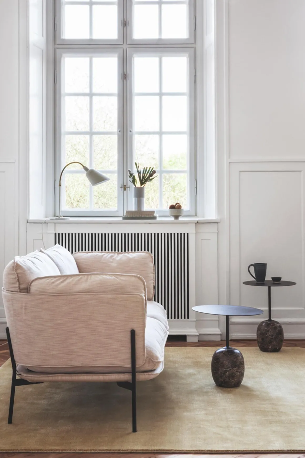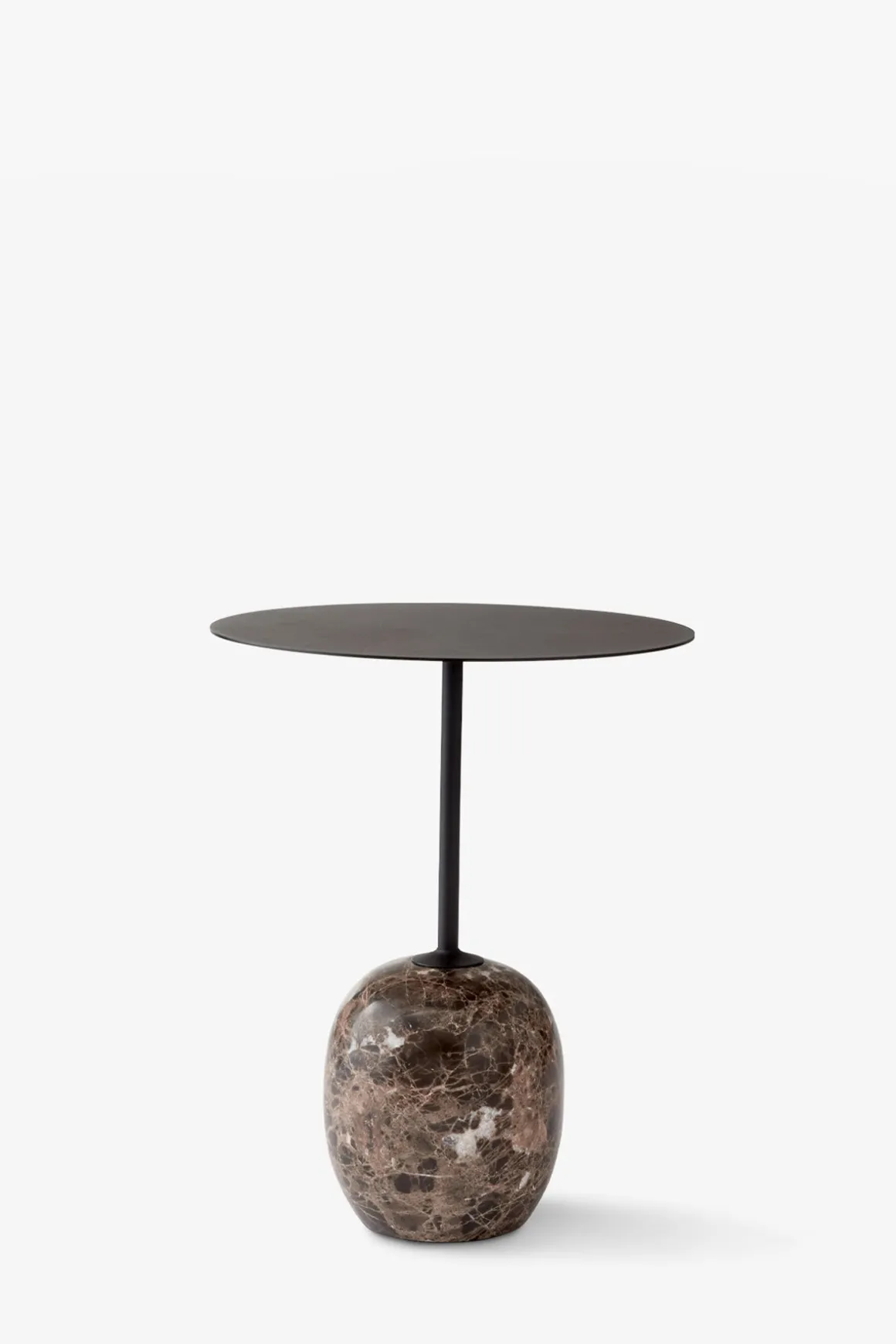 Lato LN8 sidebord fra u0026amp;Tradition, designet av Luca Nichetto. Ved første øyekast ligner Lato en skulptur, med den slanke, runde bordplaten balanserende på en oval base i nydelig marmor. Strukturen og bordplaten er laget i sort, pulverlakkert stål og komplimenterer den krakelerte emperador-marmoren. Med Lato ønsket Nichetto å designe et enkelt og tidløst sidebord som sømløst kan passe inn overalt, men likevel stjele oppmerksomheten. Lato finnes i to størrelser og med bordplate i pulverlakkert stål eller lakkert tre. Bordene kan like gjerne brukes hver for seg eller settes sammen i små grupper.