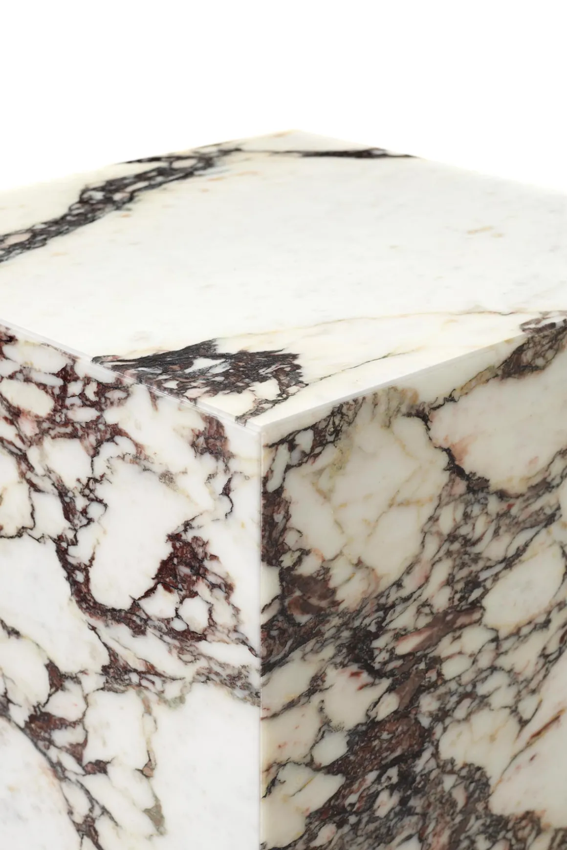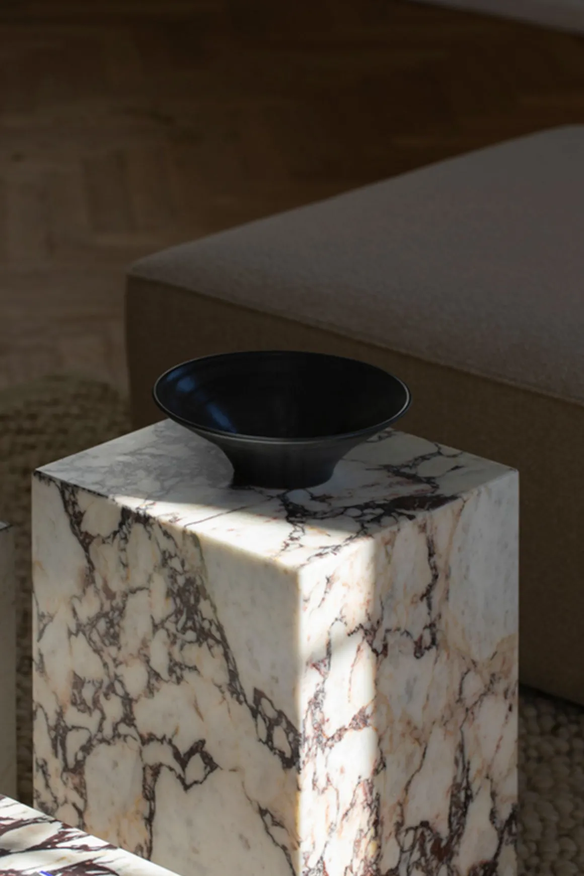 Plinth Tall sidebord i Rose Marble, også kalt Calacatta Viola marmor som er en nydelig marmortype med naturlige innslag av røde toner. Allsidig og tidløst bord håndlaget i en liten fabrikk i Portugal. Bordet har en lav sokkel som gjør at det nesten ser ut som om det svever over gulvet. Plinth har også fire små ben som kan justeres i underkant av en cm i høyden. Bena synes ikke da de er satt fire cm inn fra kanten. Den kubistiske formen er svært raffinert, myk og skulpturell. Til tross for at bordet er monumentalt har det et lett og luftig ytre. Hver marmordel er nøye utvalgt og montert for hånd for å sikre at sidene blir satt sammen perfekt. Resultatet er at dette vakre bordet er konsistent i form og kvalitet, samtidig unikt i marmormønsteret. Plinth bord kommer i flere marmorvarianter og i tre ulike størrelser. Designet av Norm Architects.