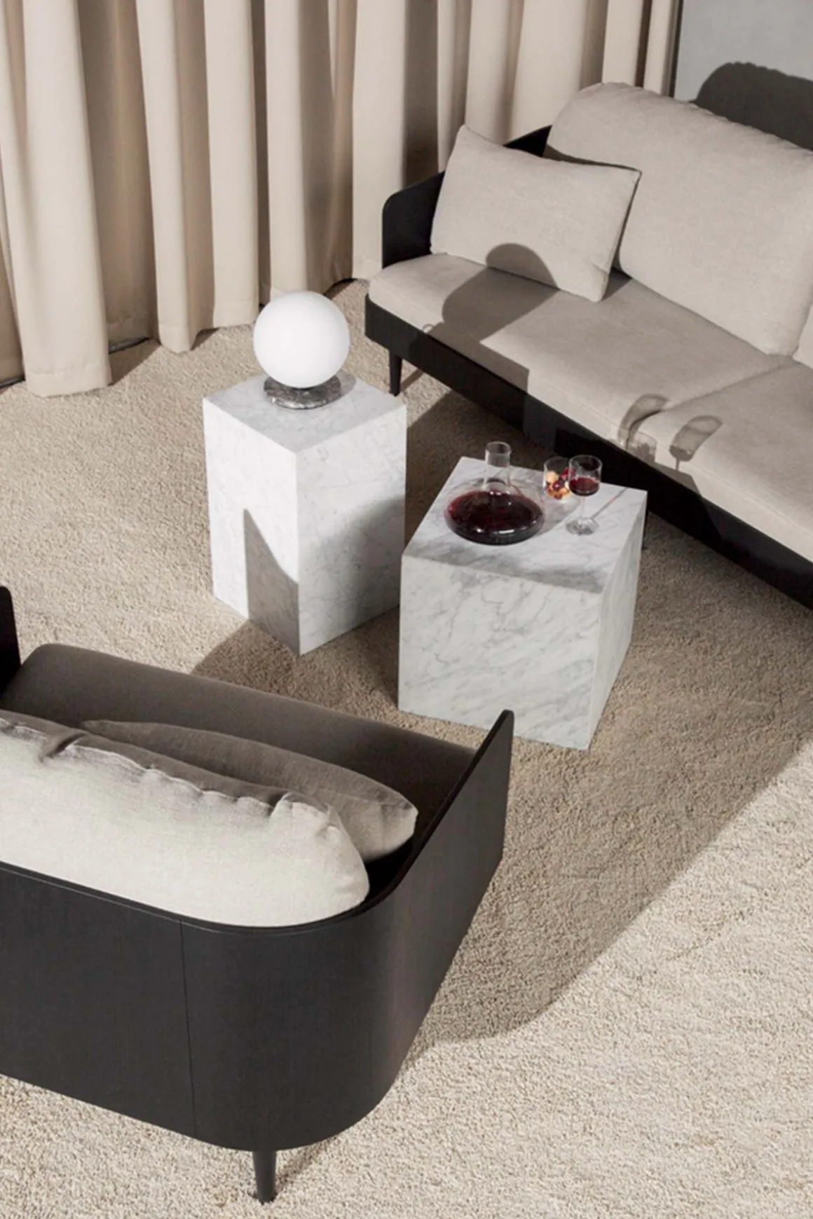 Plinth Tall sidebord i hvit marmor. Allsidig og tidløst bord håndlaget i en liten fabrikk i Portugal. Den hvite marmoren heter Carrara og er fra Italia. Bordet har en lav sokkel som gjør at det nesten ser ut som om det svever over gulvet. Plinth har også fire små ben som kan justeres i underkant av en cm i høyden. Bena synes ikke da de er satt fire cm inn fra kanten. Den kubistiske formen er svært raffinert, myk og skulpturell. Til tross for at bordet er monumentalt har det et lett og luftig ytre. Hver marmordel er nøye utvalgt og montert for hånd for å sikre at sidene blir satt sammen perfekt. Resultatet er at dette vakre bordet er konsistent i form og kvalitet, samtidig unikt i marmormønsteret. Plinth bord kommer i flere marmorvarianter og i tre ulike størrelser. Designet av Norm Architects.