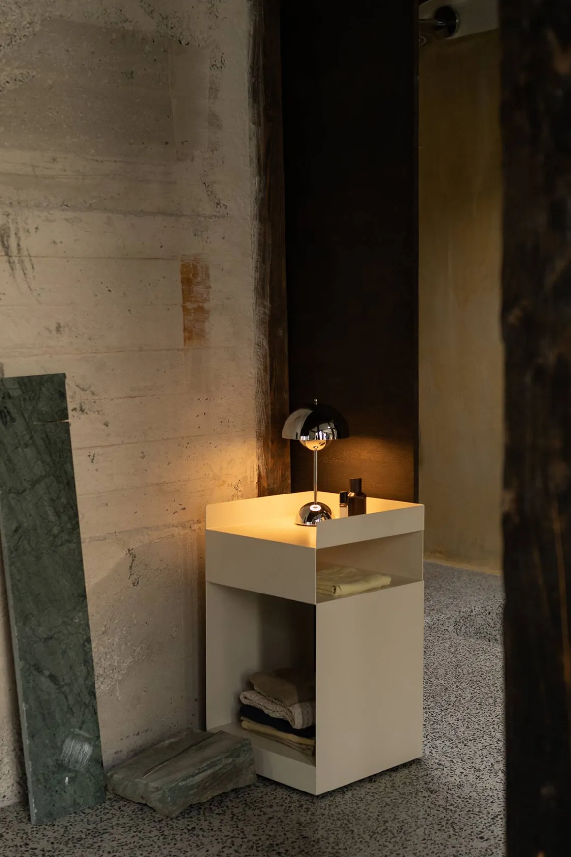 Rotate sidebord fra u0026amp;Tradition, designet av anerkjente Space Copenhagen. Rotates upretensiøse utseende motsier dets svært funksjonelle design. Laget for å oppfylle en rekke formål – bruk den på hjemmekontoret, som nattbord eller til oppbevaring på badet. Rotate kan brukes i alle rom og hjulene gjør bordet enkelt å flytte rundt der det trengs. Sidebordet er laget av stål, av ett stykke metallplate, som kuttes i to og bøyes etterpå. Til slutt sveises de to delene sammen og pulverlakkeres. Rotate kommer i fargene Terracotta, Hunter, Ivory og Merlot.