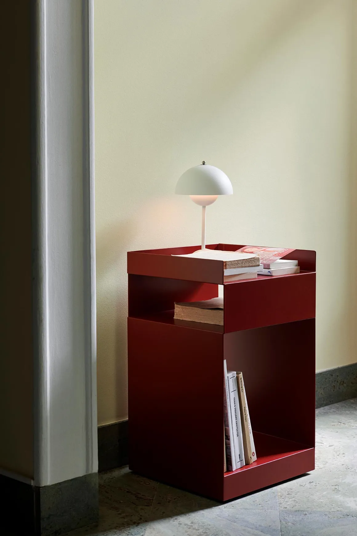 Rotate sidebord fra u0026amp;Tradition, designet av anerkjente Space Copenhagen. Rotates upretensiøse utseende motsier dets svært funksjonelle design. Laget for å oppfylle en rekke formål – bruk den på hjemmekontoret, som nattbord eller til oppbevaring på badet. Rotate kan brukes i alle rom og hjulene gjør bordet enkelt å flytte rundt der det trengs. Sidebordet er laget av stål, av ett stykke metallplate, som kuttes i to og bøyes etterpå. Til slutt sveises de to delene sammen og pulverlakkeres. Rotate kommer i fargene Terracotta, Hunter, Ivory og Merlot.
