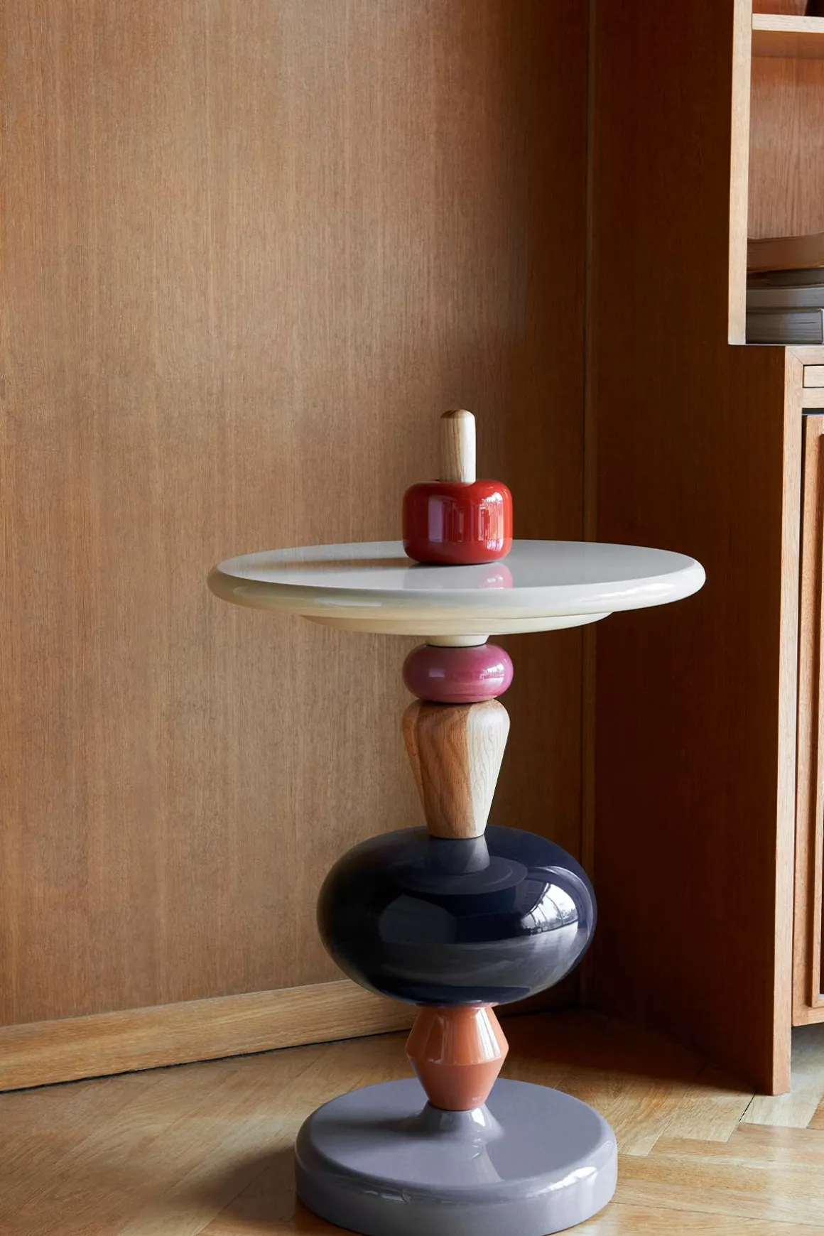 Shuffle sidebord fra u0026amp;Tradition, designet av den norske designeren Mia Hamborg. Shuffle-bordet minner om klassiske treleker i både valg av farger, form og konstruksjon og ideen kom fra Brio-klosser som Mia lekte med som barn. Den lekne konstruksjone gjør at man kan bestemme form, farge og høyde på bordet. Designet revitaliserer det nordiske håndverket med å dreie tre som kan dateres helt tilbake til vikingtiden. Hamborg kombinerer funksjonalitet med humor og vil at folk skal kjenne en følelse av glede når de opplever designet hennes. Bordet er laget av lakkert MDF og heltre. De lakkerte delene er PU-belagt for å sikre en slitesterk og høyglans overflate. Shuffle finnes i to fargekombinasjoner.