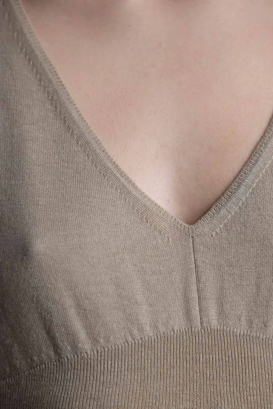 Strikket singlett fra Vince i en lett og finstrikket ullblanding med kashmir, perfekt for varmere dager. Den dype V-utringningen foran og bak gir et åpent og sommerlig uttrykk, mens en ribbestrikket kant under bysten gir en lett drapert form og markerer midjen på en diskré måte. Et mykt og pustende plagg som fungerer like godt alene som under en cardigan.