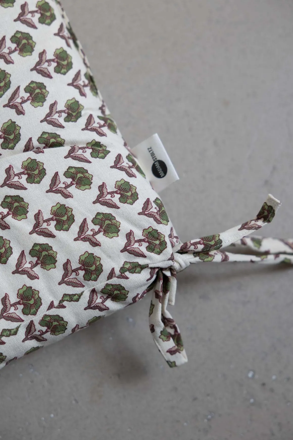 Fargerik stolpute i off-white, grønn og burgunder med heldekkende mønster inspirert av indiske blokktrykk. Laget i slitesterk bomull med fyll av resirkulerte bomullsrester. Gir ekstra komfort på stol, terrasse eller rett på bakken, og knytes fast i hjørnene. Unngå direkte sollys, da fargene kan falme.