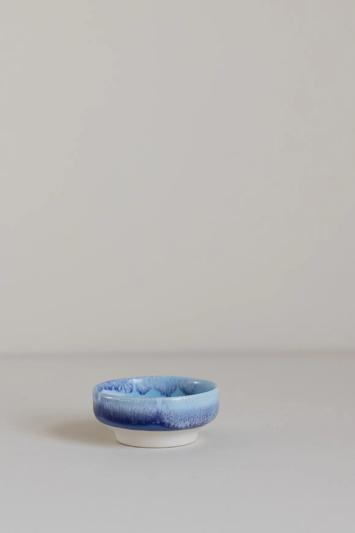 Dip Dish er en liten, håndlaget skål med en bred, flat fot som gir stabilitet på flate underlag. Hver skål er unik, med små variasjoner i form og glasur. Den passer perfekt til soyasaus, aioli, oliven og nøtter, eller som oppbevaring for smykker.