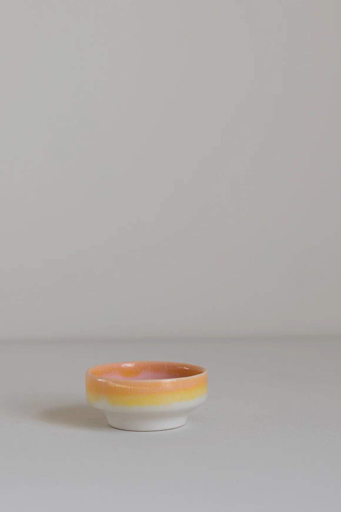 Dip Dish er en liten, håndlaget skål med en bred, flat fot som gir stabilitet på flate underlag. Hver skål er unik, med små variasjoner i form og glasur. Den passer perfekt til soyasaus, aioli, oliven og nøtter, eller som oppbevaring for smykker.