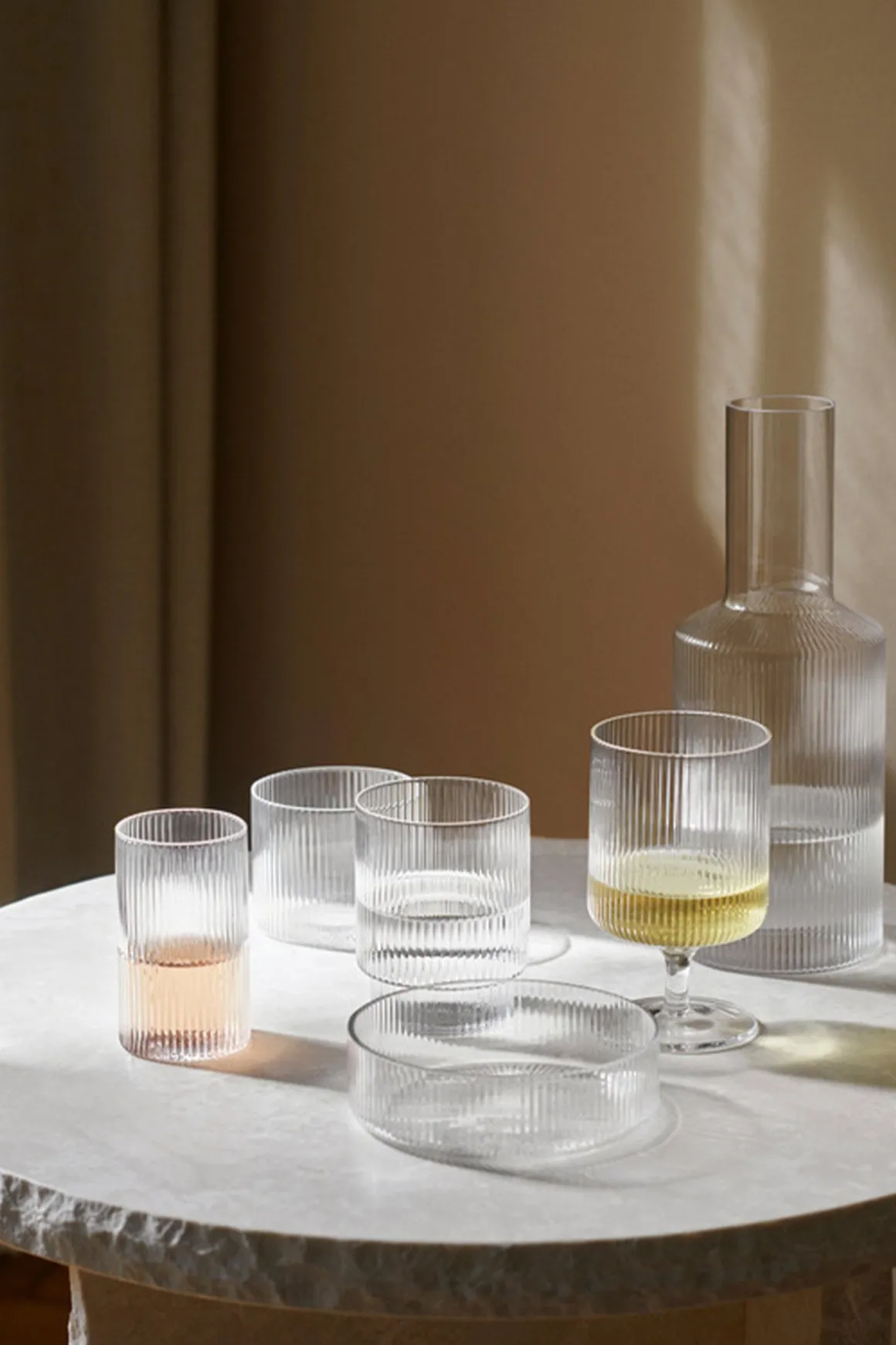 Ripple Serving Bowls fra Ferm Living er et sett med fire dekorative, lave skåler med riflet overflate. Laget av munnblåst og håndlaget glass med samme karakteristiske overflaten som kjennetegner den populære Ripple-serien. Bruk settet til å servere smakfulle snacks, oliven, tapenader eller andre velsmakende småretter til gjestene dine, eller disk opp med en deilig dessert.
