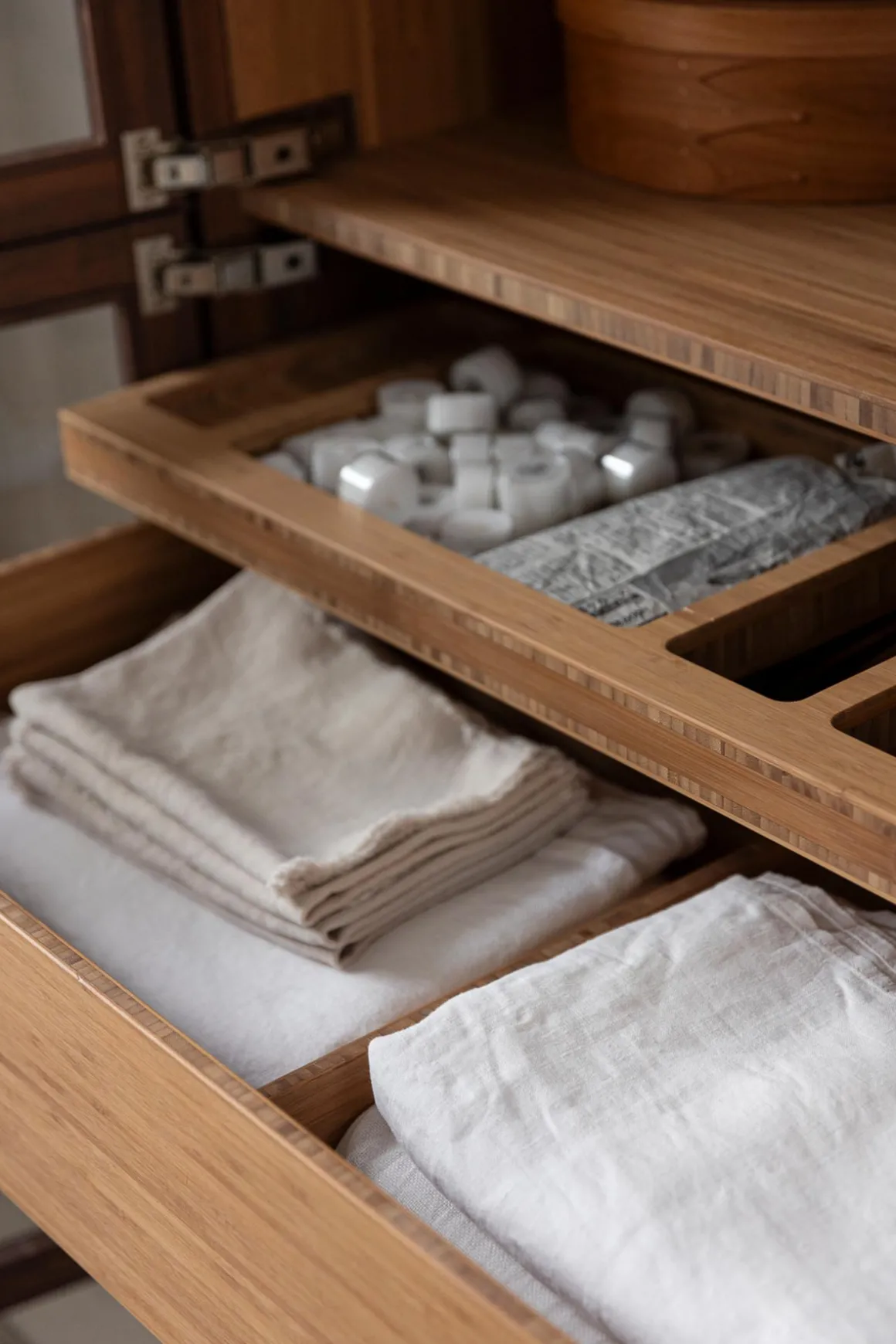 Vitrineskap i bambus fra norske Ask og Eng, laget i eksklusivt samarbeid med Bolina. Det skreddersydde, håndlagde skapet i solid, brun bambus har dører i glass og håndtak og detaljer i varm messing som harmonerer perfekt. Her er ingenting overlatt til tilfeldighetene og hver detalj er nøye gjennomtenkt. Skapet kan brukes som et frittstående møbel der du trenger det i huset eller du kan innlemme det som en del av kjøkkenet eller spisestuen for eksempel. Vis fram utvalgte skatter, serviser, vaser, objekter eller tekstiler og bruk skuffene til oppbevaring av andre ting som ikke trenger å synes. Skapet er designet og håndlaget på Ask og Eng・Workshop i Drammen. Skapet kan bestilles i et større utvalg farger/finisher og hardware og detaljer i ulike metaller- kom innom butikken for å se skapet live og snakk med oss så hjelper vi deg å finne den perfekte match til ditt hjem.