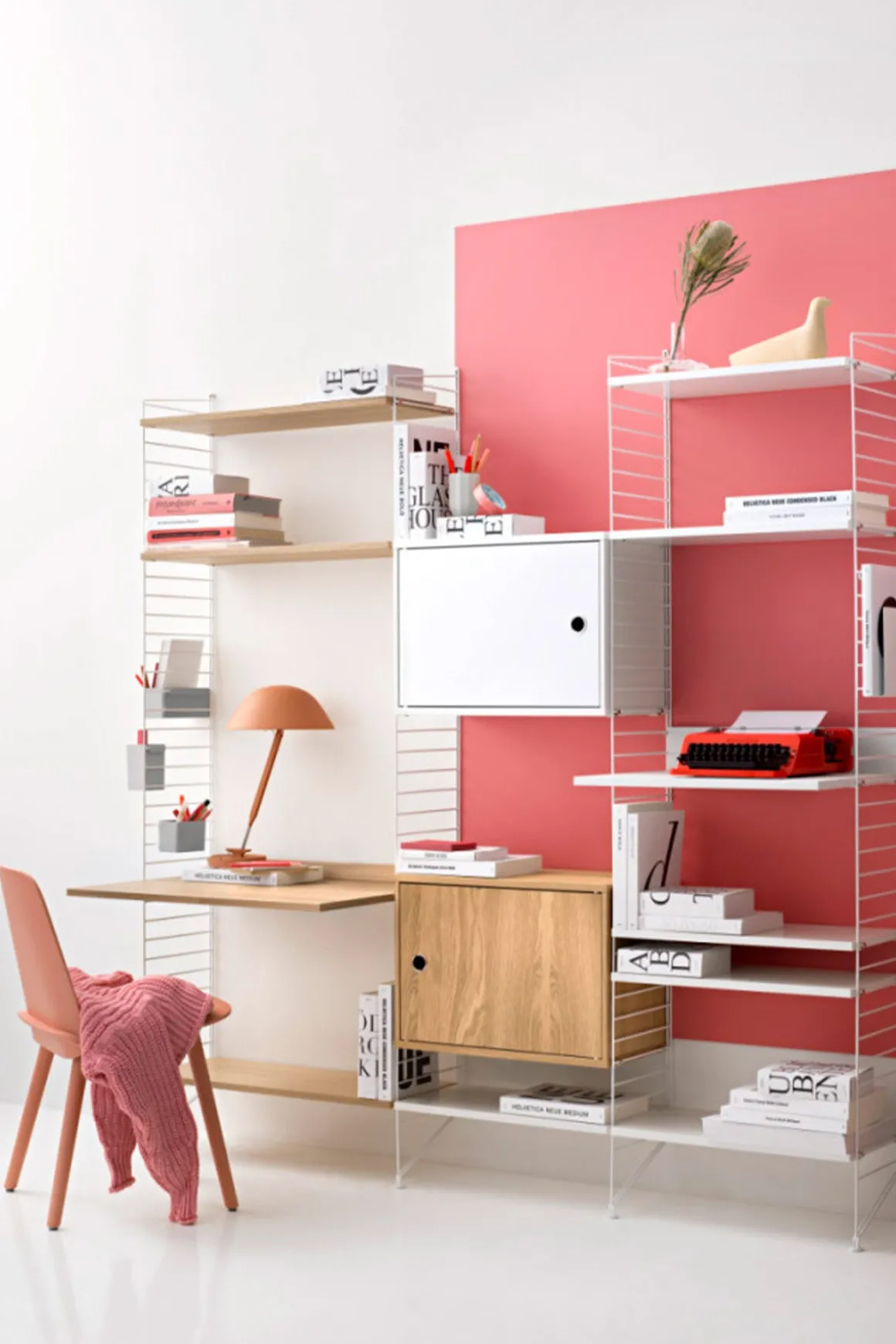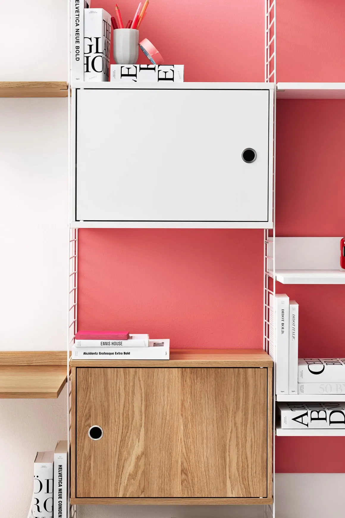 Dette skapet selges som en enkeltdel du praktisk kan kombinere i ditt String® System med gavler som er 30 cm dype. Tilgjengelige i én bredde, 58 cm. Visuelt er det fint å tilføre et større element til Stringhyllen din, som dette skapet, samtidig som det er praktisk med ekstra oppbevaring. Døren kan monteres på hver side av skapet. Den kommer med én justerbar indre hylle. Følger med opphengsbeslag.
