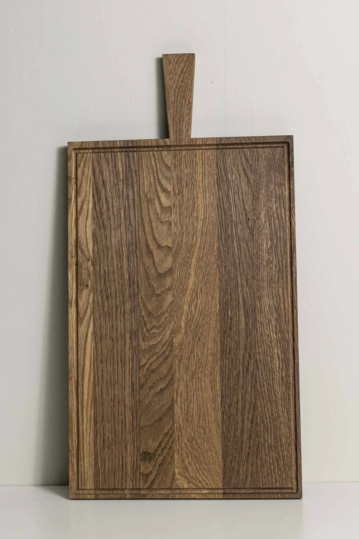 Bredt, rektangulært skjærebrett i naturlig, mørkoljet eik fra Raumgestalt. Brettet har et fint håndtak og en naturlig overflate med saftrille lang kanten. Skjærebrettet vil kunne være et dekorativt element i kjøkkeninnredningen din og gi et varmt, rustikt utseende. Brettet er også praktisk til servering av oster og forskjellig snacks.