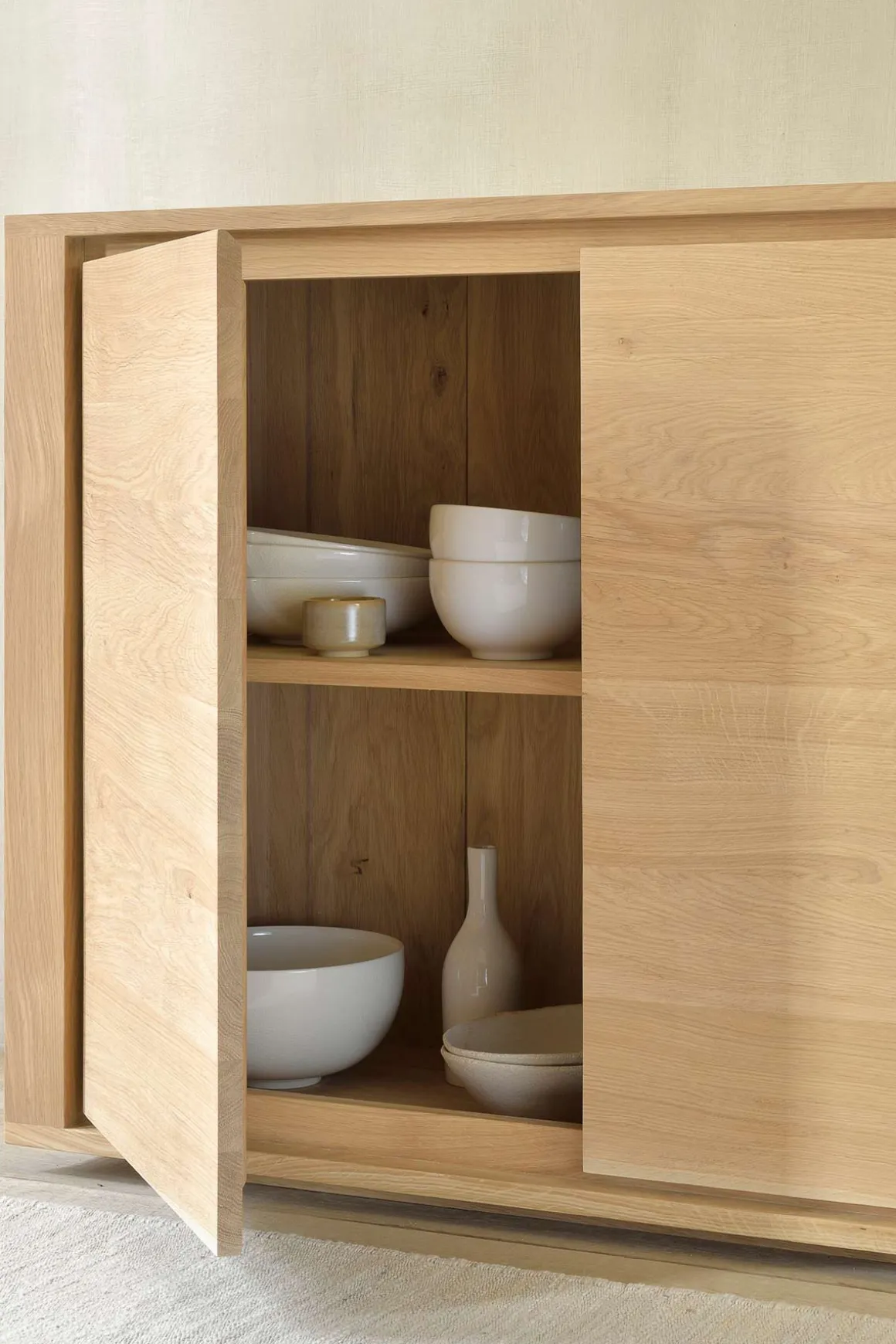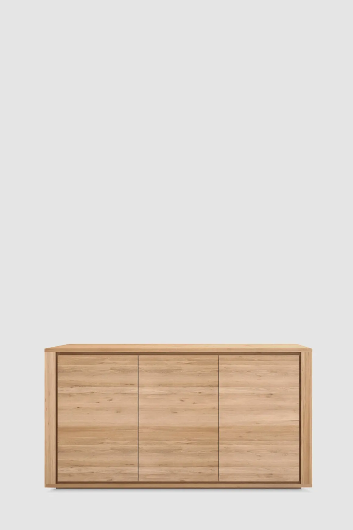 Shadow-kolleksjonen fra belgiske Ethnicraft kjennetegnes av enkelt og robust design med stramme linjer som komplimenterer den nordiske stilen. Skjenken er laget i massiv, oljet eik, som gir det en klassisk look med en moderne vri. Skjenken har veldig god lagringsplass med tre dører, og er helt uten synlige håndtak og knotter som understreker det minimalistiske uttrykket. Shadow er et vakkert oppbevaringsmøbel til stua, soverommet eller i gangen og er laget av høykvalitets, europeisk, oljet eik. Ethnicraft lar materialet komme til sin rett ved å la de naturlige variasjonene og teksturene i treet være synlige. Kombinasjonen av moderne design, sterk konstruksjon og varige materialer gjør det til den ideelle oppbevaringsløsningen for alle hjem.