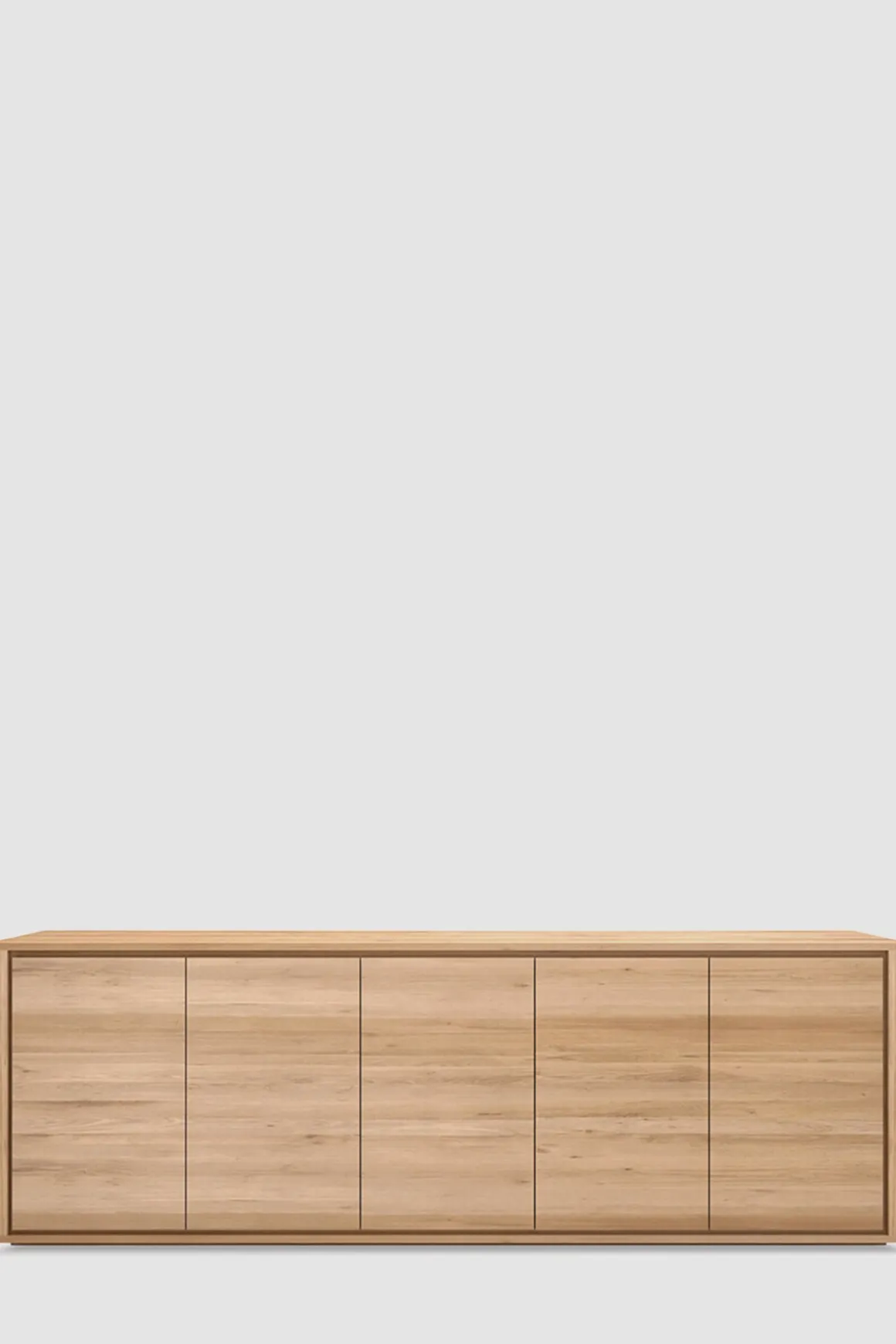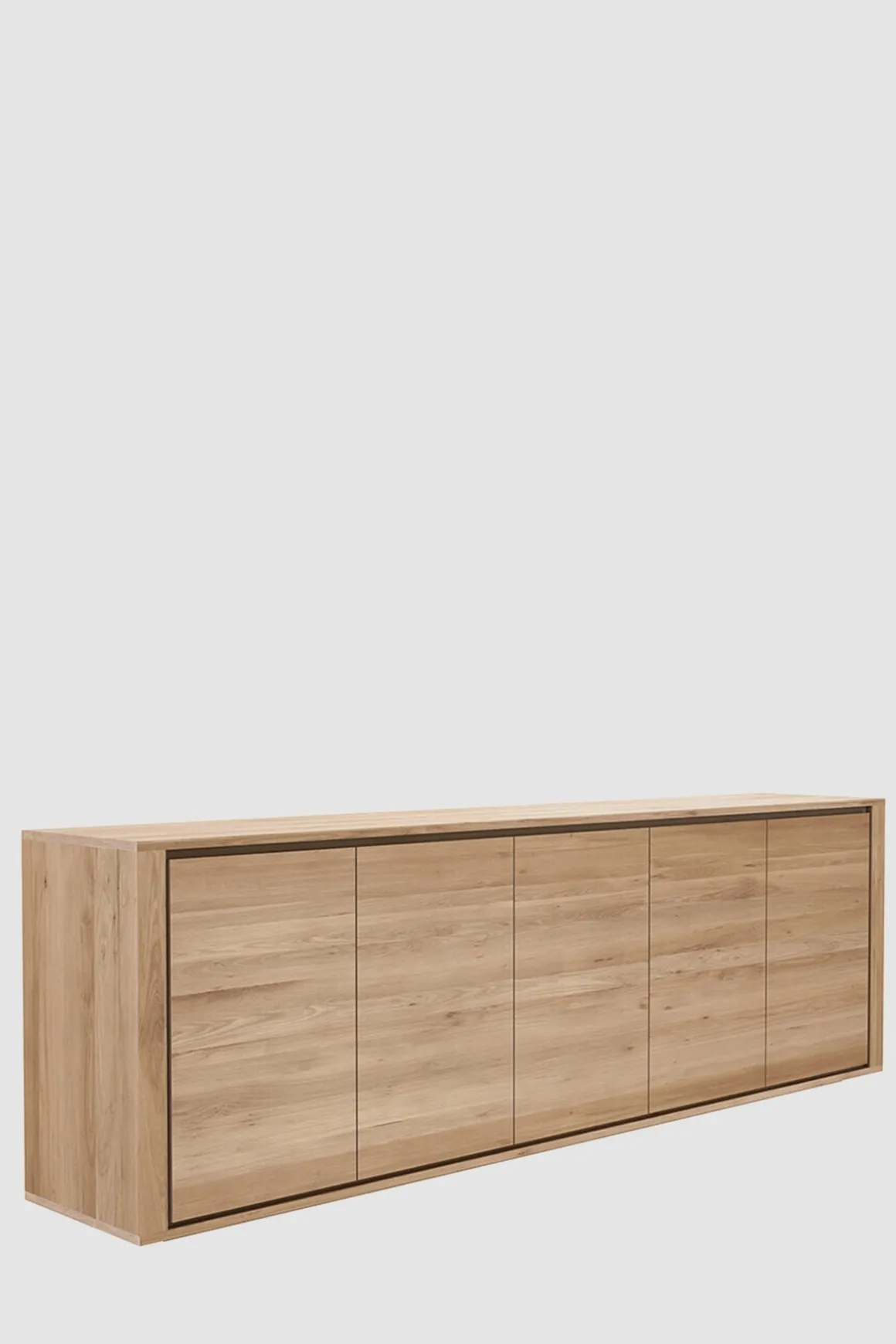 Shadow-kolleksjonen fra belgiske Ethnicraft kjennetegnes av enkelt og robust design med stramme linjer som komplimenterer den nordiske stilen. Skjenken er laget i massiv, oljet eik, som gir det en klassisk look med en moderne vri. Skjenken har veldig god lagringsplass med fem dører, og er helt uten synlige håndtak og knotter som understreker det minimalistiske uttrykket. Shadow er et vakkert oppbevaringsmøbel til stua, soverommet eller i gangen og er laget av høykvalitets, europeisk, oljet eik. Ethnicraft lar materialet komme til sin rett ved å la de naturlige variasjonene og teksturene i treet være synlige. Kombinasjonen av moderne design, sterk konstruksjon og varige materialer gjør det til den ideelle oppbevaringsløsningen for alle hjem.