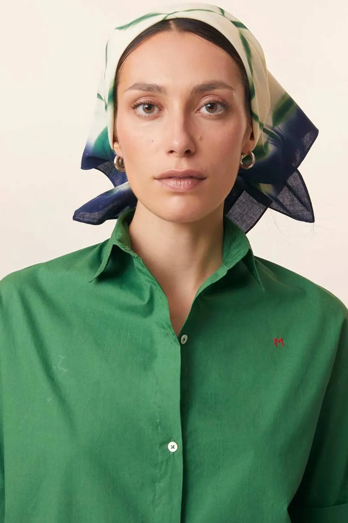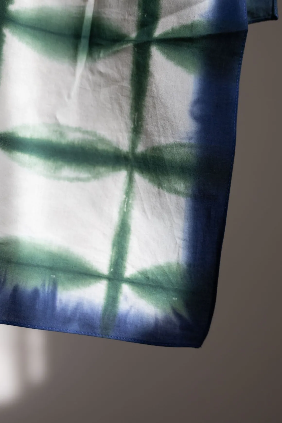 Skjerf N°766 i fargen Bottle Green er farget for hånd med den tradisjonelle shibori-teknikken, som gir hvert skjerf et unikt mønster. De grønne og blå tonene skaper et organisk og flytende uttrykk, noe som gir stoffet dybde og liv. Den lette bomullskvaliteten gjør skjerfet behagelig å bruke, enten det knyttes rundt halsen, i håret eller som en dekorativ detalj.