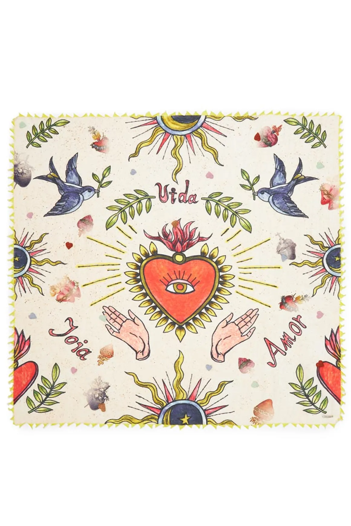 Vida-skjerfet fra Faliero Sarti er et fargerikt blikkfang med livlig print og sterke symboler. Skjerfet er laget i en myk blanding av bomull og silke, og har en dekorativ kant med vekselsvis mønster som gir et lekent og grafisk uttrykk. Bruk skjerfet som bandana, knyt det rundt halsen eller fest det på vesken. Vida er et lite kunstverk av et tilbehør som tilfører personlighet og farge til ethvert antrekk.