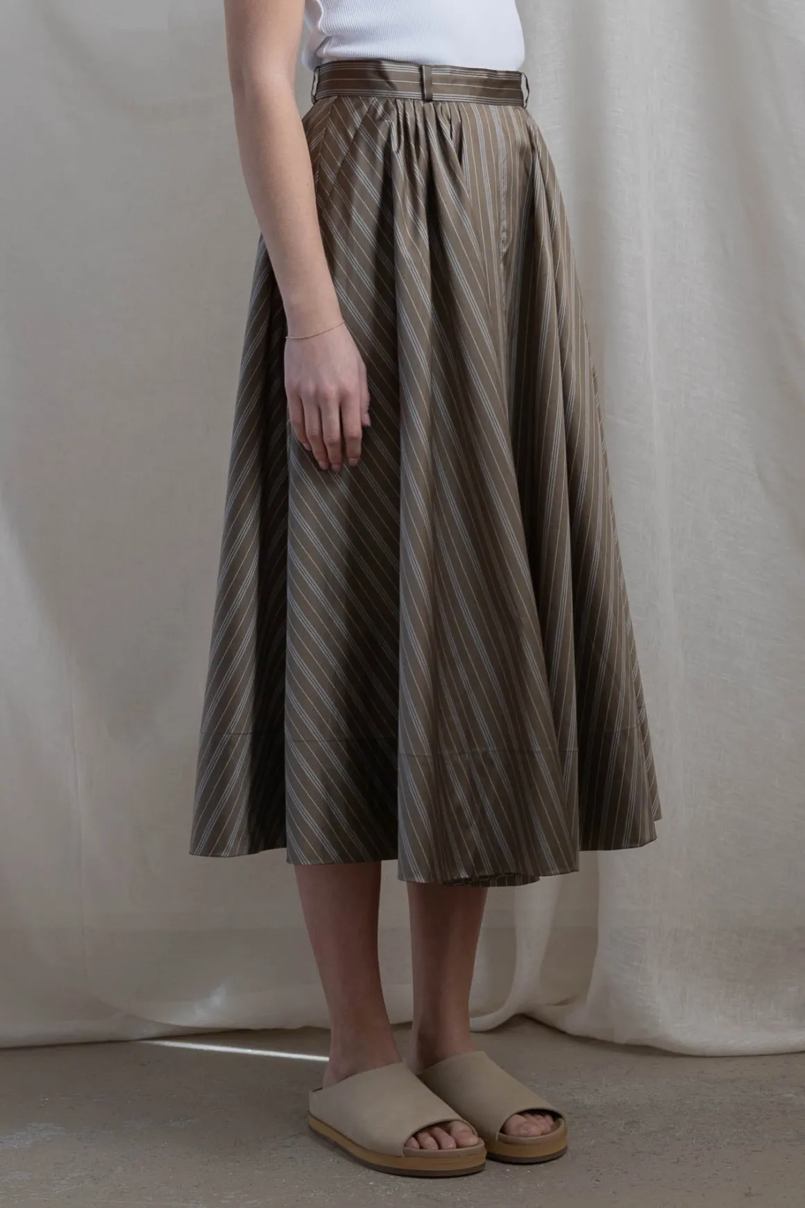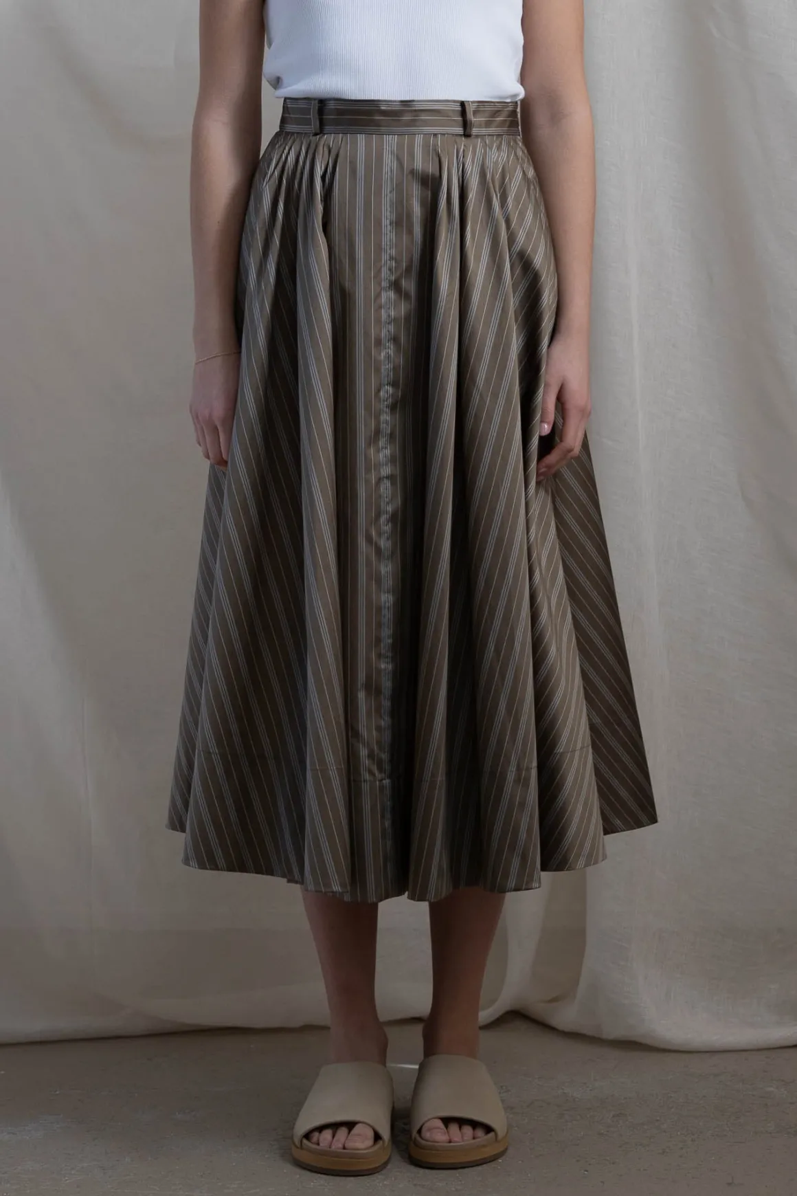 Novo-skjørtet fra MKDT er et midi-skjørt med bredt plissert liv og en lett utsvingt silhuett som gir fint fall og bevegelse. Det stripete stoffet har en diskré glans og en myk, glatt struktur som føles behagelig mot huden. Skjørtet har fast linning foran, elastikk bak og praktiske stikklommer i sidene.