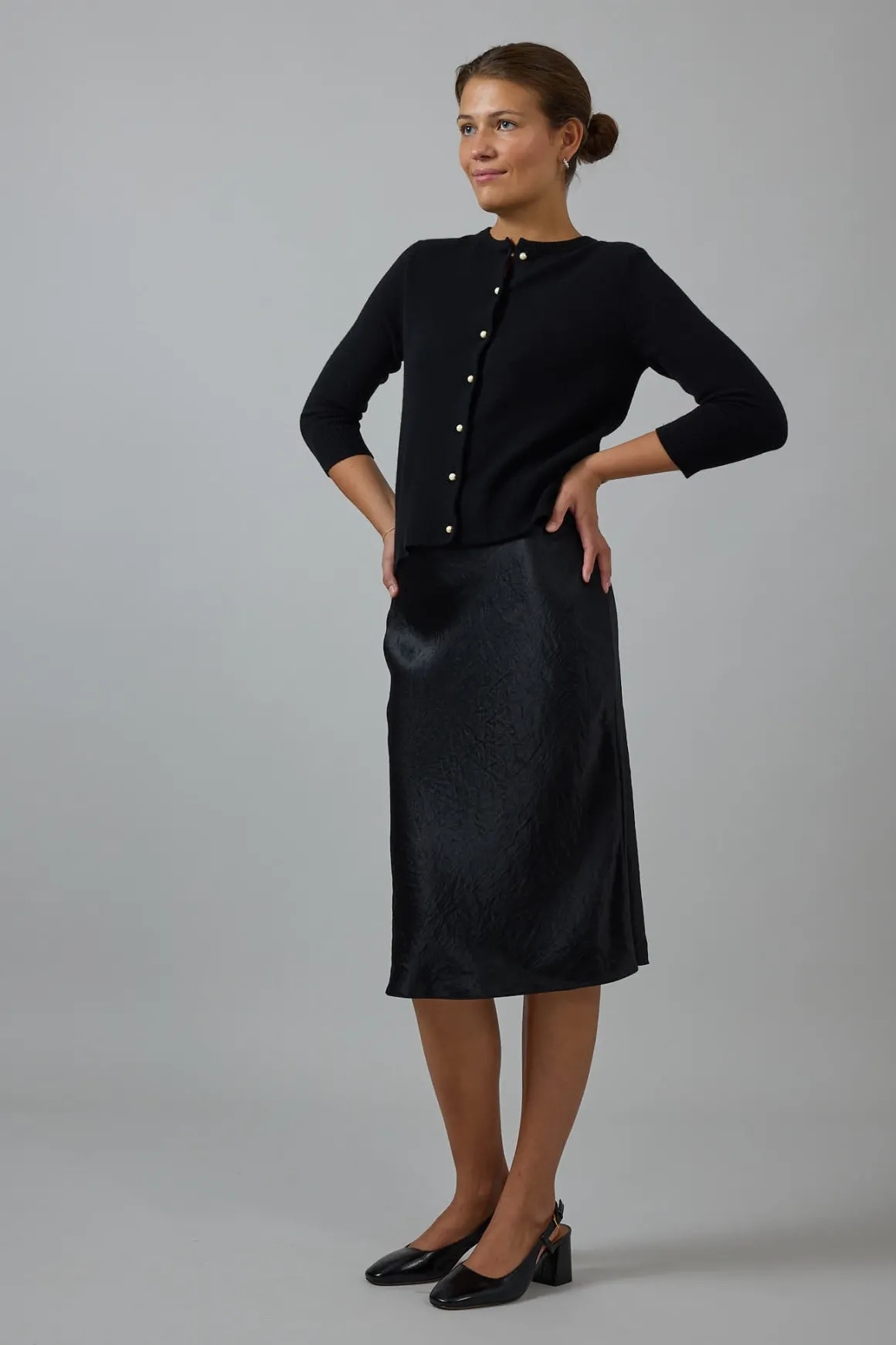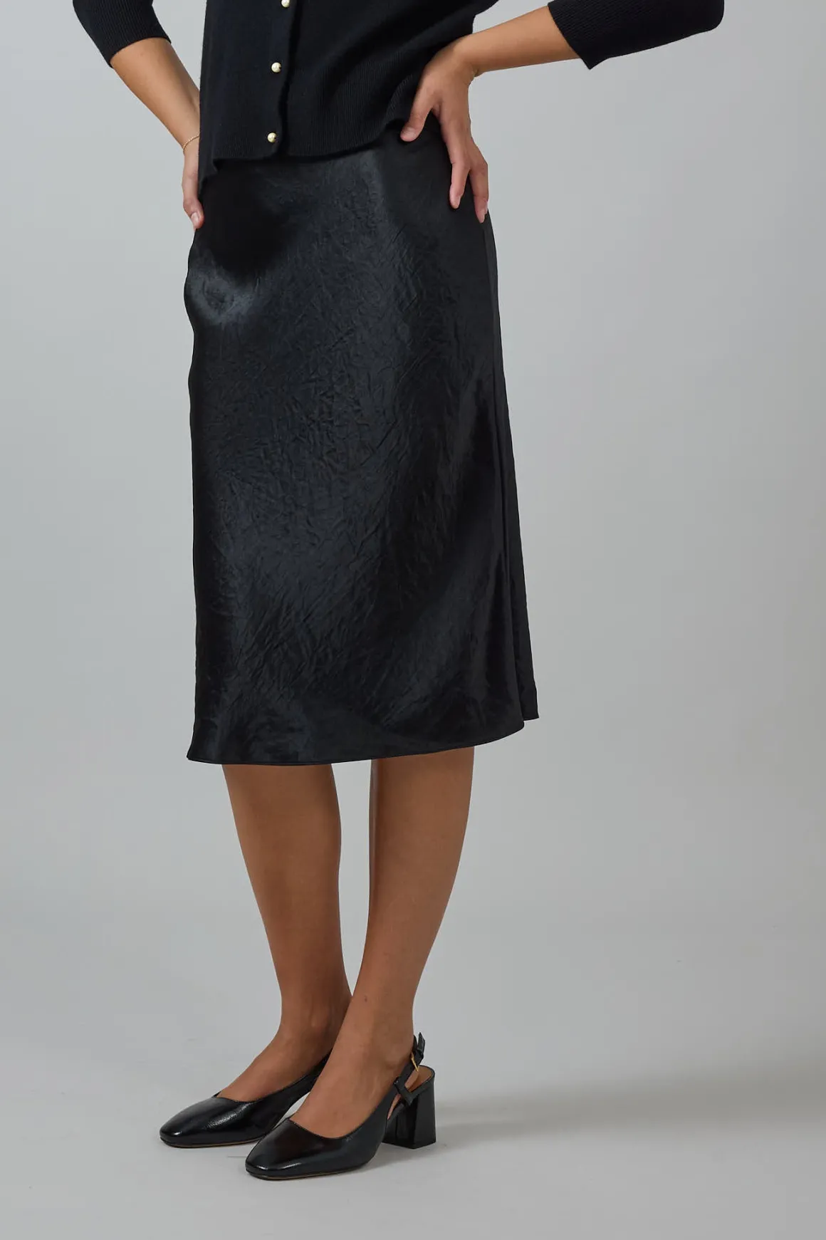 Slip Black-skjørtet er en av Vince sine absolutte bestselgere. Dette sorte skjørtet kombinerer en avslappet passform med elastisk strikk i livet for maksimal komfort. Skjørtet har et minimalistisk design uten knapper eller glidelås og faller rett ned fra livet med en subtil bevegelse i kanten som gir et sofistikert uttrykk. Laget av acetat, et luksuriøst materiale som minner om ekte silke, har skjørtet en nydelig glans og et flytende fall. Dette er en tidløs klassiker i garderoben som du kan bruke igjen og igjen.