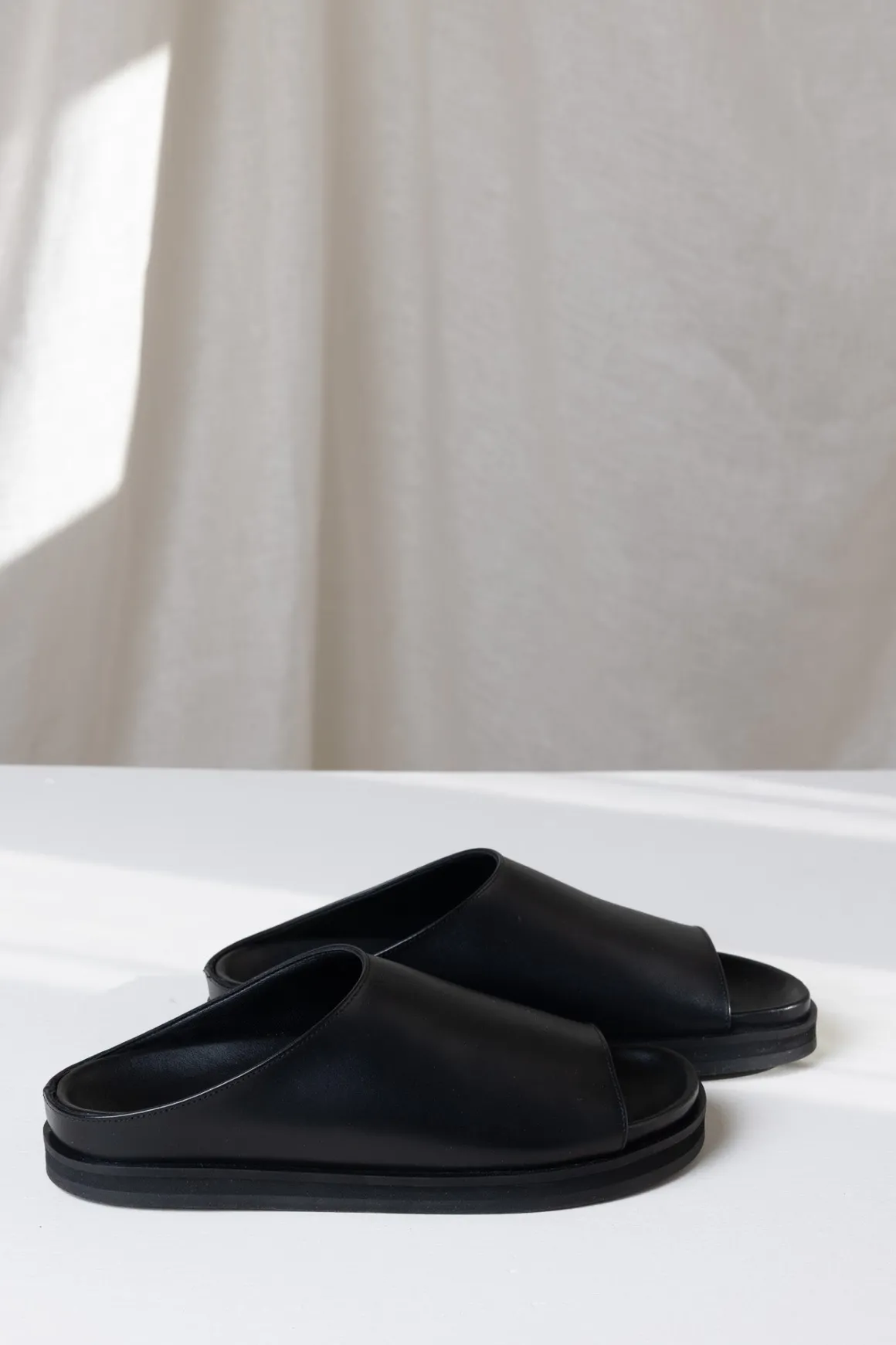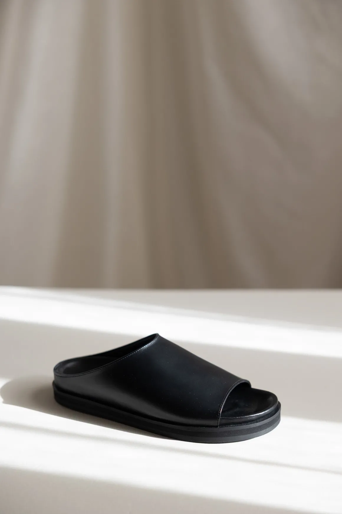 Sko – Slippers Julita Nappa Black Sandaler fra Yori Jomo er stilrene og komfortable slippers laget i mykt semsket skinn. Den enkle silhuetten gir et tidløst uttrykk, mens den åpne designen gjør dem perfekte for varme dager.