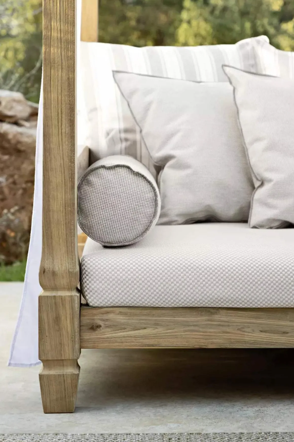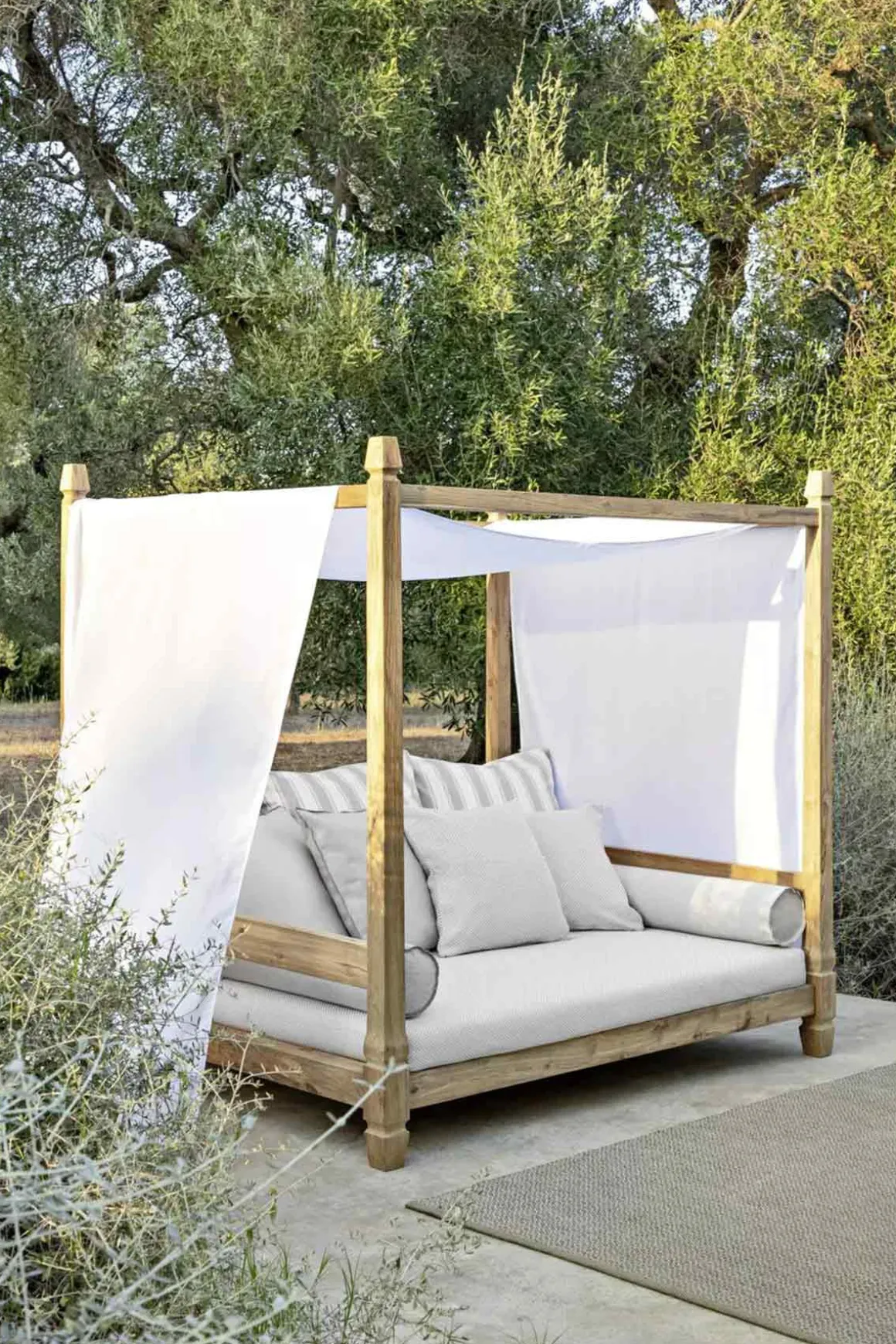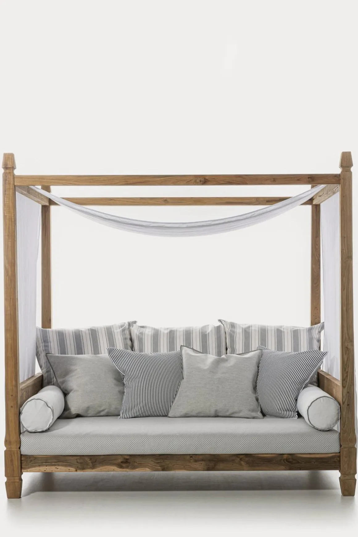 Utesofa Jeko 07 fra italienske Gervasoni, designet av Paola Navone. Jeko-kolleksjonen søker den eksotiske stemningen i klassisk og luksuriøs kolonistil. Bordene, sofaene og lenestolene har rammer i ECOTeak, et materiale hentet fra resirkulerte teakbjelker og elementer gjenvunnet fra riving av tradisjonelle trehus på øya Java i Indonesia, godkjent av lokale myndigheter. De gjenvunnede elementene kuttes til, repareres med resirkulert tre, monteres og slipes for å fremheve det originale treverket, og til slutt håndpolert med hampkluter og spon. Jeko 07 sofaen kjennetegnes av et bredt og lavt sete, med avtagbar pute. Ekstra løse puter kan legges til for å øke komforten ytterligere. Søylene i hvert hjørne av sofaen lager en baldakin med en hvit gardin som gir intimitet og behagelig skygge. Kombiner med andre møbler fra Jeko-serien for en komplett look og få den luksuriøse resort-følelsen hjemme. Trekket på sofaen er i polypropylen som er både vann, smuss-og muggavvisende. Stoffet er mykt, sterkt og holdbart, og trekket er avtagbart og kan vaskes på 30 grader.