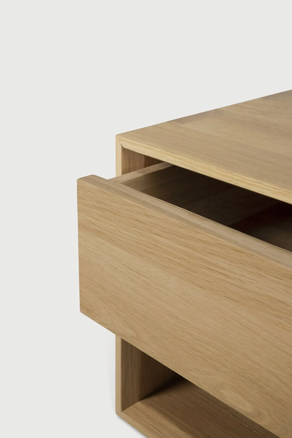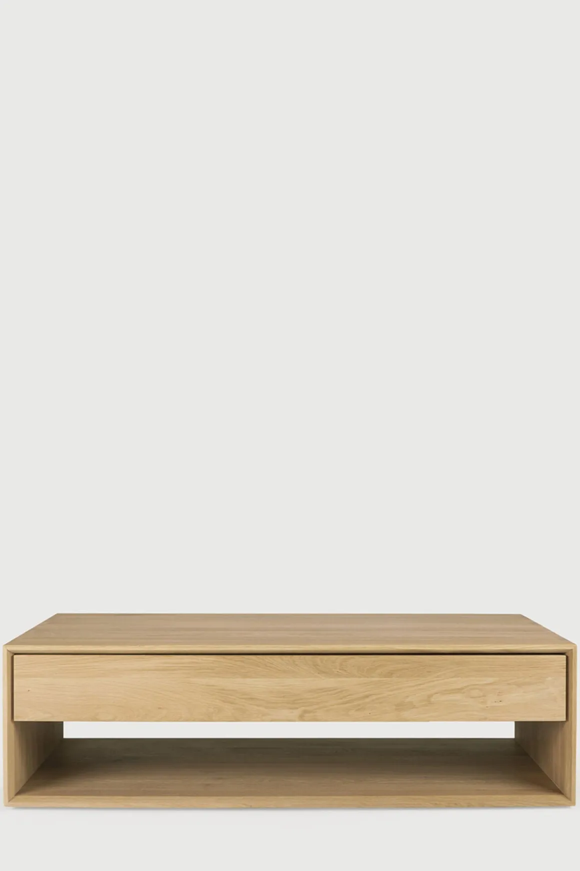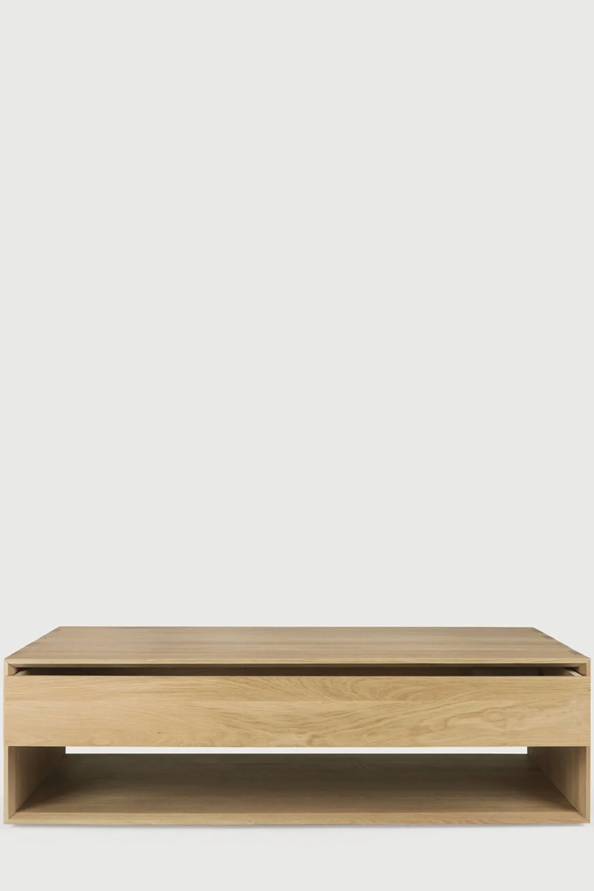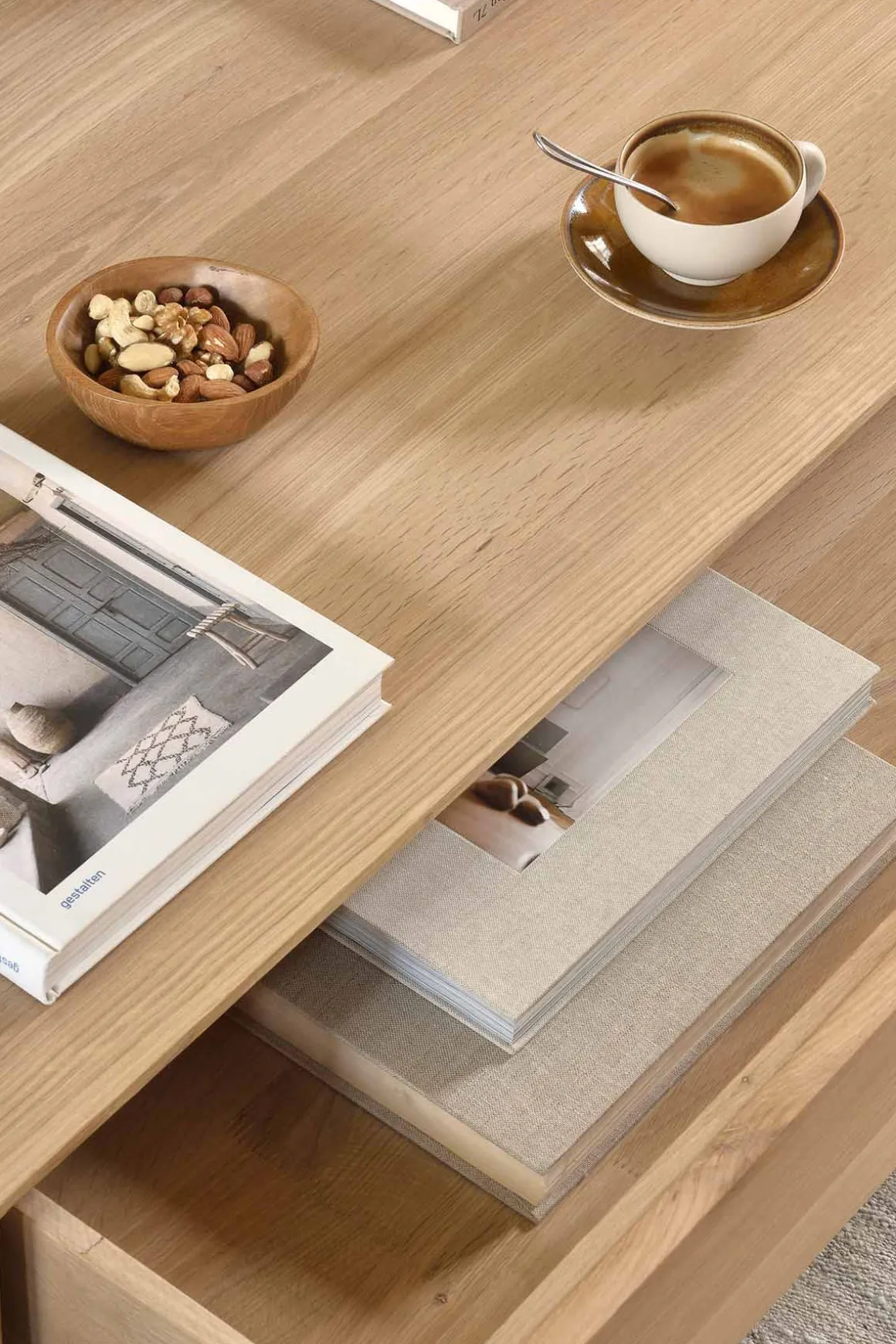 Nordic sofabord i massiv, oljet eik fra belgiske Ethnicraft. Nordic-serien er designet av anerkjente Alain Van Havre og kjennetegnes av raffinert design kombinert med renheten fra massivt tre. De stramme linjene, mykheten fra naturlig treverk og den romslige skuffen gjør at sofabordet innehar akkurat de kvalitetene vi ser etter i nordiske hjem; Solide, naturlige materialer, godt håndverk og praktisk utforming så møblene kan leve et langt liv.
