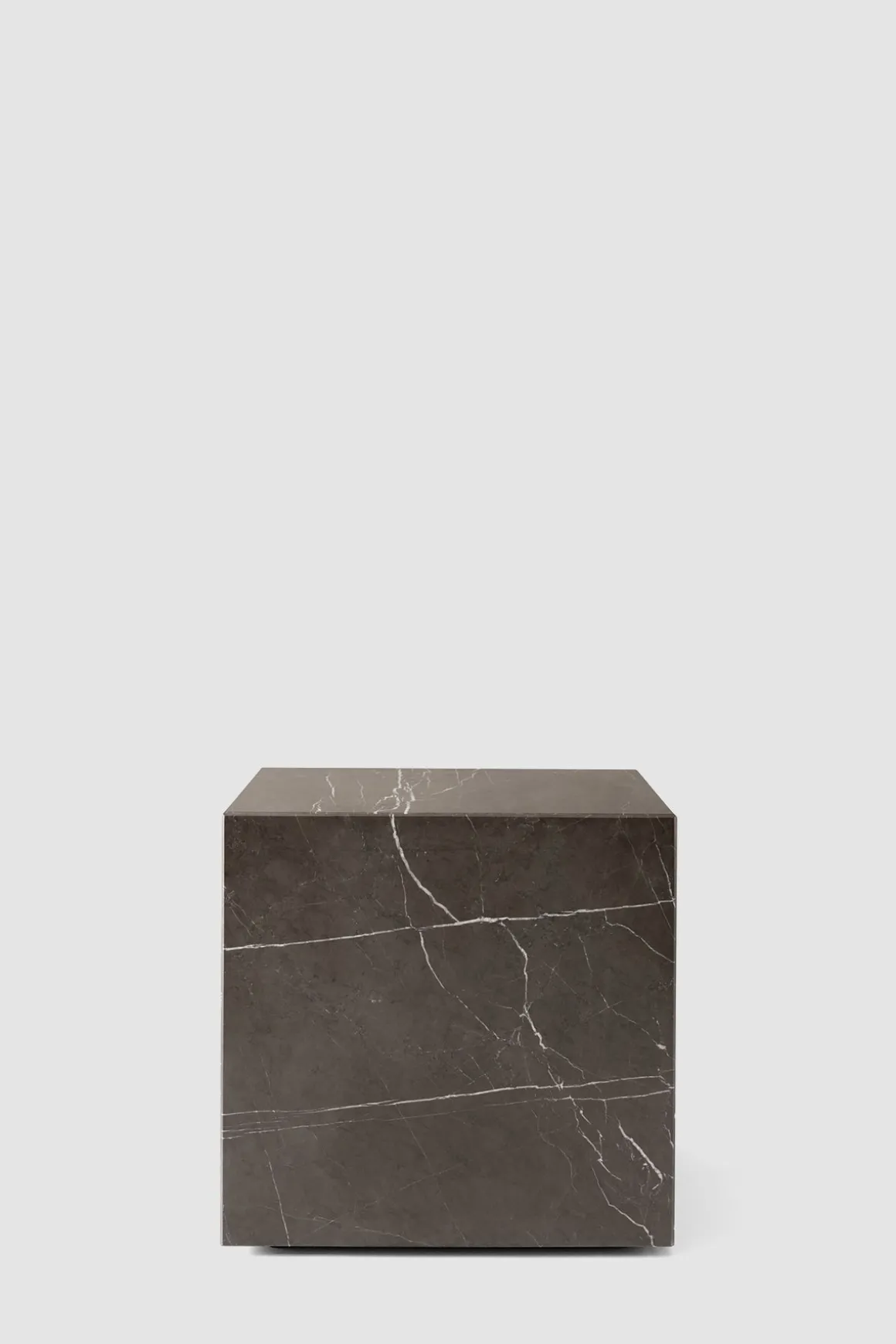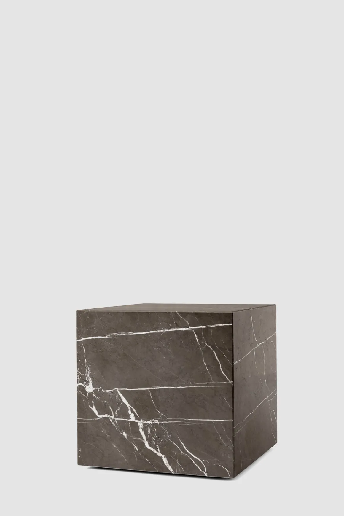 Plinth Cubic sidebord i brun og grå Kendzo marmor. Allsidig og tidløst bord håndlaget i en liten fabrikk i Portugal. Bordet har en lav sokkel som gjør at det nesten ser ut som om det svever over gulvet. Plinth har også fire små ben som kan justeres i underkant av en cm i høyden. Bena synes ikke da de er satt fire cm inn fra kanten. Den kubistiske formen er svært raffinert, myk og skulpturell. Til tross for at bordet er monumentalt har det et lett og luftig ytre. Hver marmordel er nøye utvalgt og montert for hånd for å sikre at sidene blir satt sammen perfekt. Resultatet er at dette vakre bordet er konsistent i form og kvalitet, samtidig unikt i marmormønsteret. Designet av Norm Architects. Plinth kommer i flere størrelser og i ulike typer marmor.
