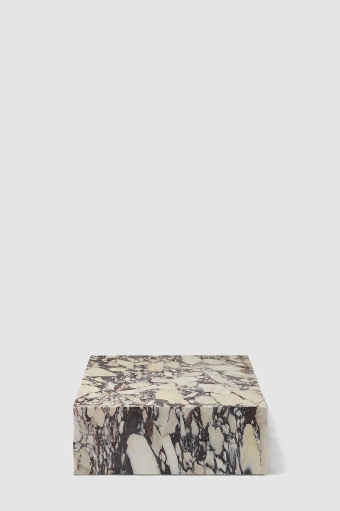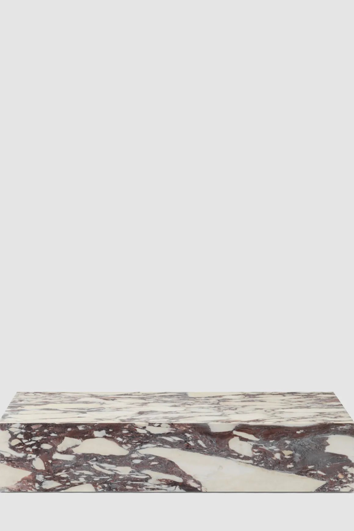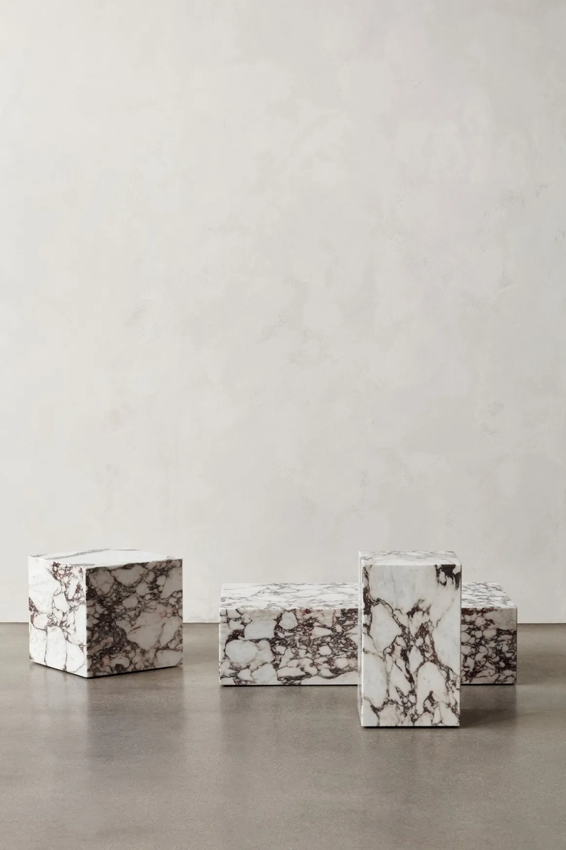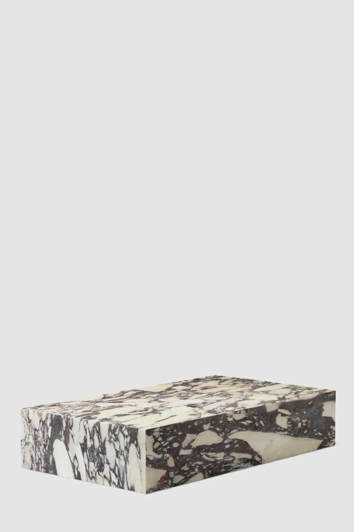 Plinth Grand sofabord er en supersized versjon av det klassiske Plinth Low-bordet. Laget i Calacatta Viola marmor med en dyplilla farge som bukter seg rundt basen i unike formasjoner, og gir et organisk, særegent uttrykk til hvert bord. Bordet er formet til et perfekt balansert rektangel, og er et allsidig og multifunksjonelt sofabord håndlaget i en liten fabrikk i Portugal. Bordet har en lav sokkel som gjør at det nesten ser ut som om det svever over gulvet. Plinth har også fire små ben som kan justeres i underkant av en cm i høyden. Bena synes ikke da de er satt fire cm inn fra kanten. Plinth tilbys i fire marmortyper med unike årringer i tillegg til Kunis Breccia-stein. Designet egner seg til en rekke bruksområder og rom. Plint Grand er ideell som både sofabord eller utstillingsbord for dekorative gjenstander. Det er også et skulpturelt objekt i seg selv, som løfter et rom med sin sofistikerte og lysreflekterende finish.