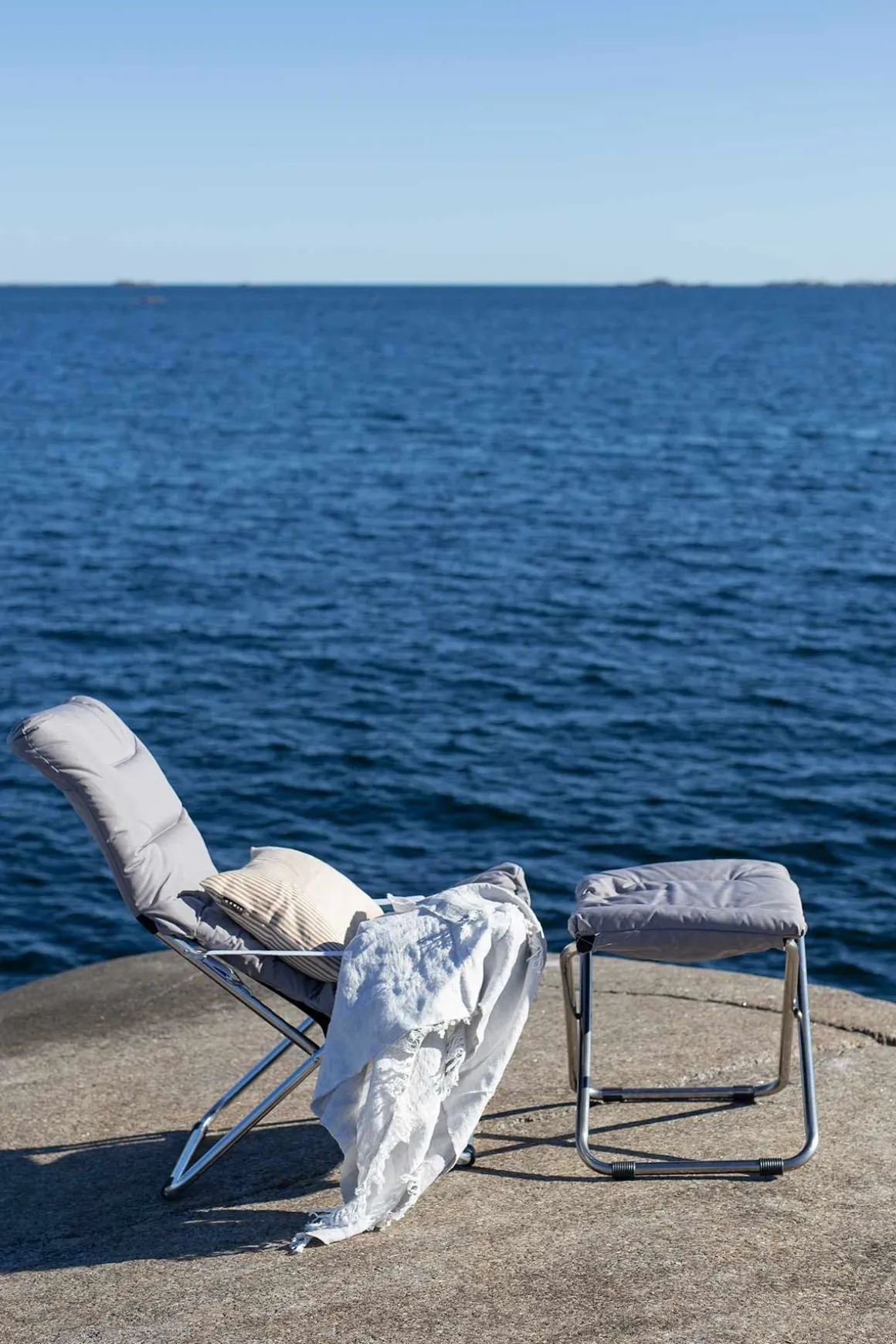 Fiesta-solstol i lysegrå fra Fiam. Minimalistisk design av Francesco Favagrossa, med behagelig pute som gir deg ultimat sittekomfort. Du kan justere stolen i flere ulike posisjoner, den kan enkelt foldes sammen og er svært lett. Den avtagbare puten gjør stolen praktisk og lett å vedlikeholde. Dette er den optimale solstolen for avslappning ute i finværet.