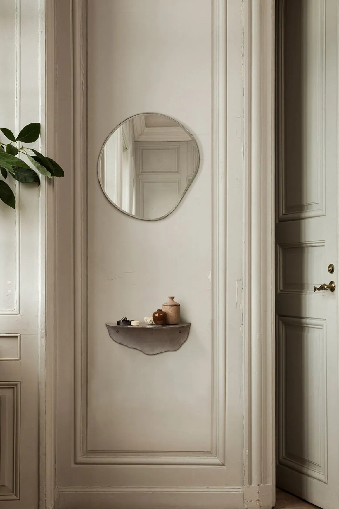 Det populære Pond speilet fra Ferm Living utforsker organiske former for klassiske speil med metallramme. Inspirert av frittflytende bevegelser av vann, inviterer speilet åpne og flytende former inn i hjemmet ditt. De buede kantene er rammet inn med en metallkant i mørk krom, og speilet kan henges flere måter, slik at du kan finne den perfekte passformen for rommet og dine behov. Virkelig et unikt speil som vil sette et personlig preg på hjemmet ditt. Perfekt i stuen, på soverommet eller i gangen.