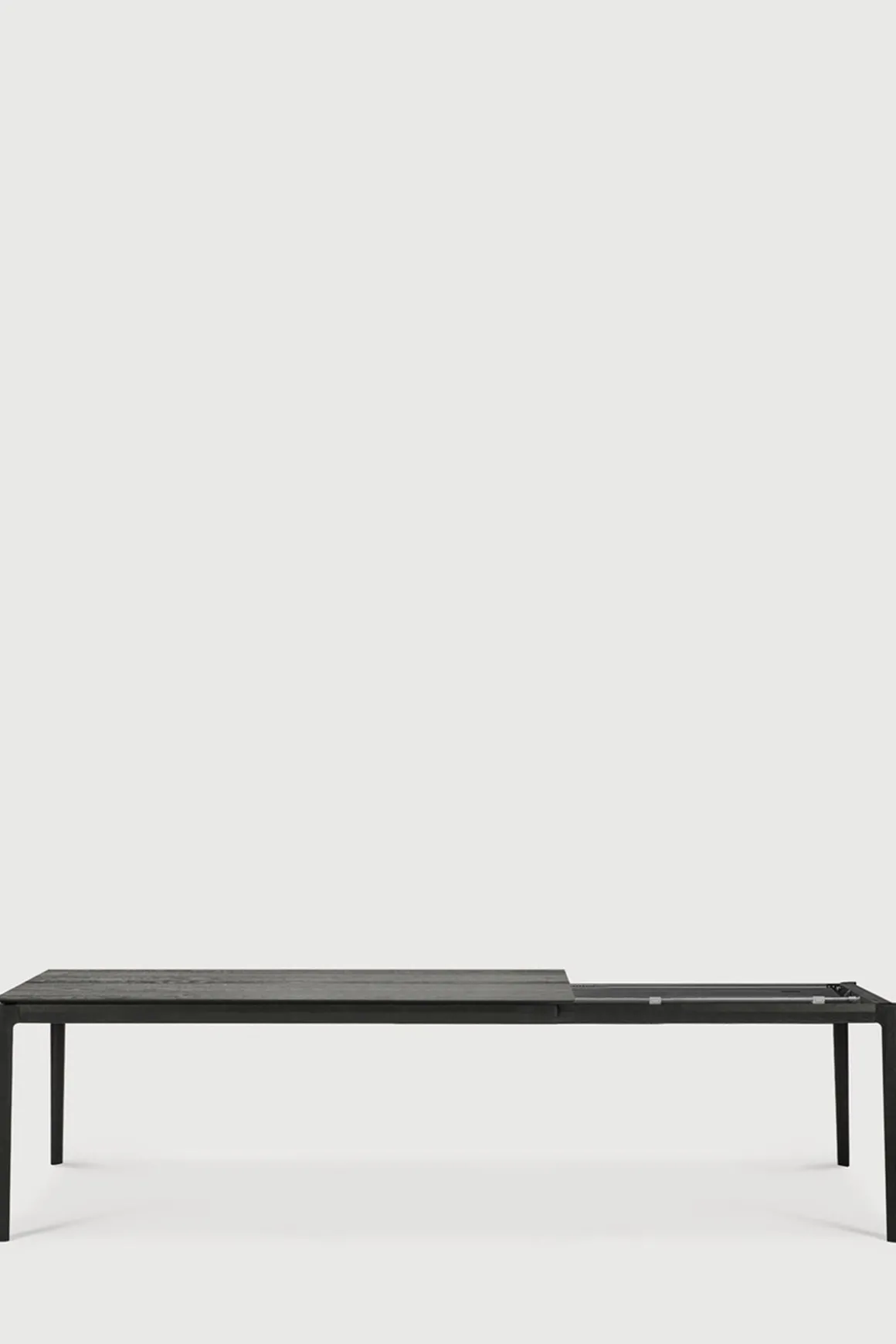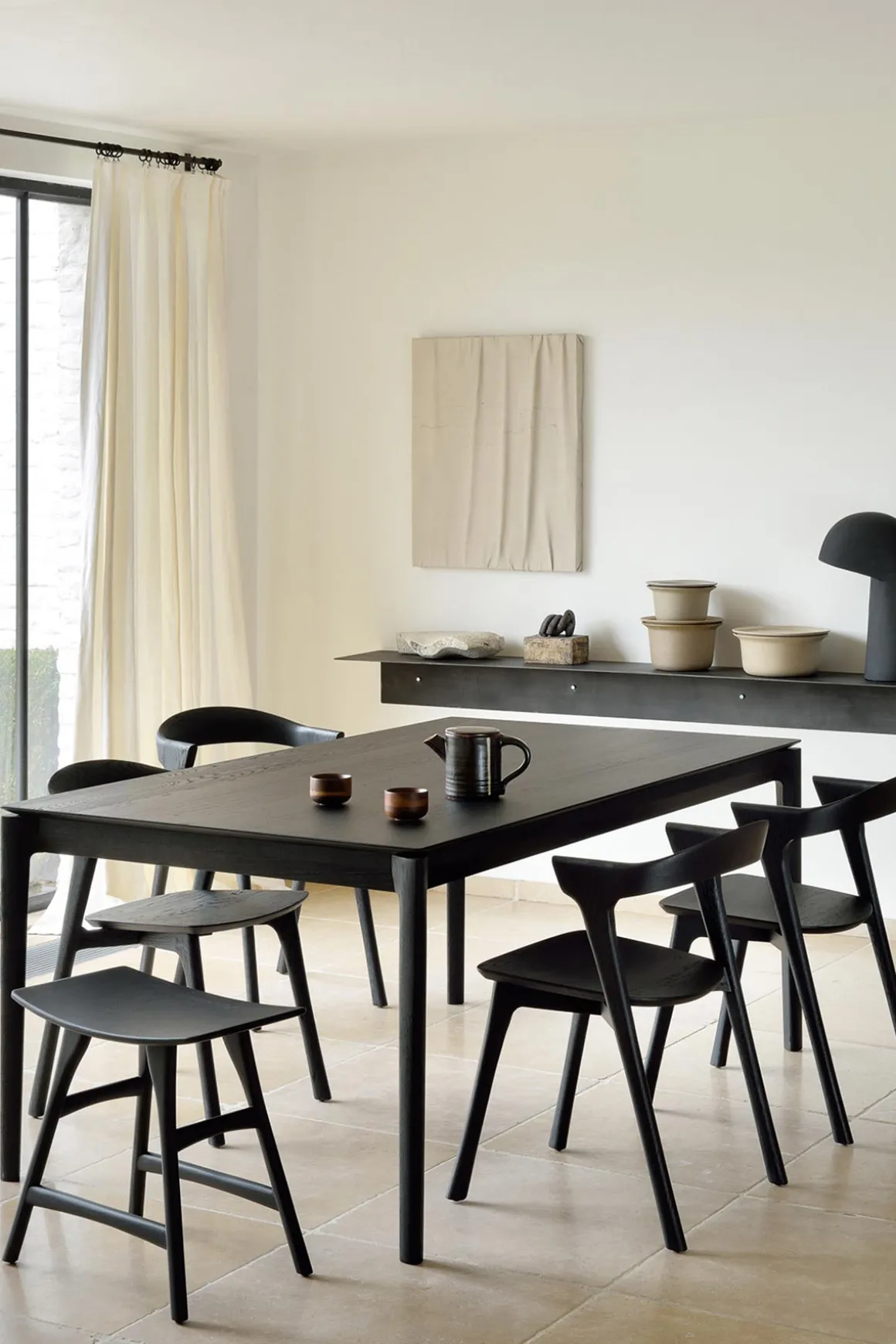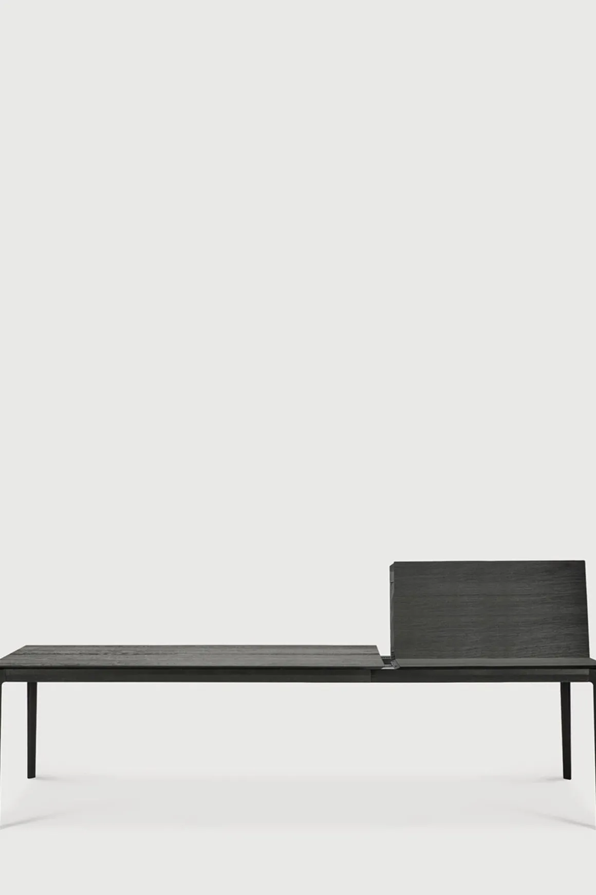 Bok spisebord i solid, sortlakkert eik med ileggsplate fra belgiske Ethnicraft, designet av Alain van Havre. Det forlengbare bordet måler 180cm og 280cm med ileggsplaten, perfekt hvis du har flere til bords en dag. Bordet har et luftig og minimalistisk uttrykk med en solid konstruksjon. Designet er enkelt, med komplekse detaljer som gjør det tidløst og personlig. Ethnicraft har fokus på å bruke europeisk eik i høy kvalitet og lar materiale komme til sin rett ved å beholde de naturlige varisasjonene og teksturene i treet. Dette er et bord du kan glede deg over i mange år fremover og som vil passe i alle hjem.