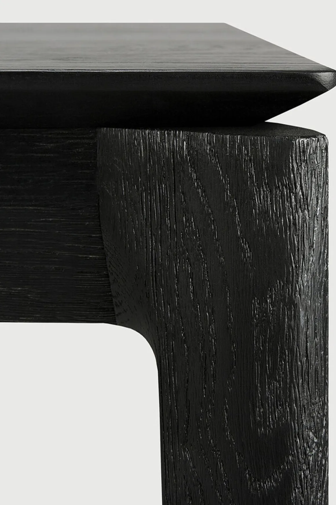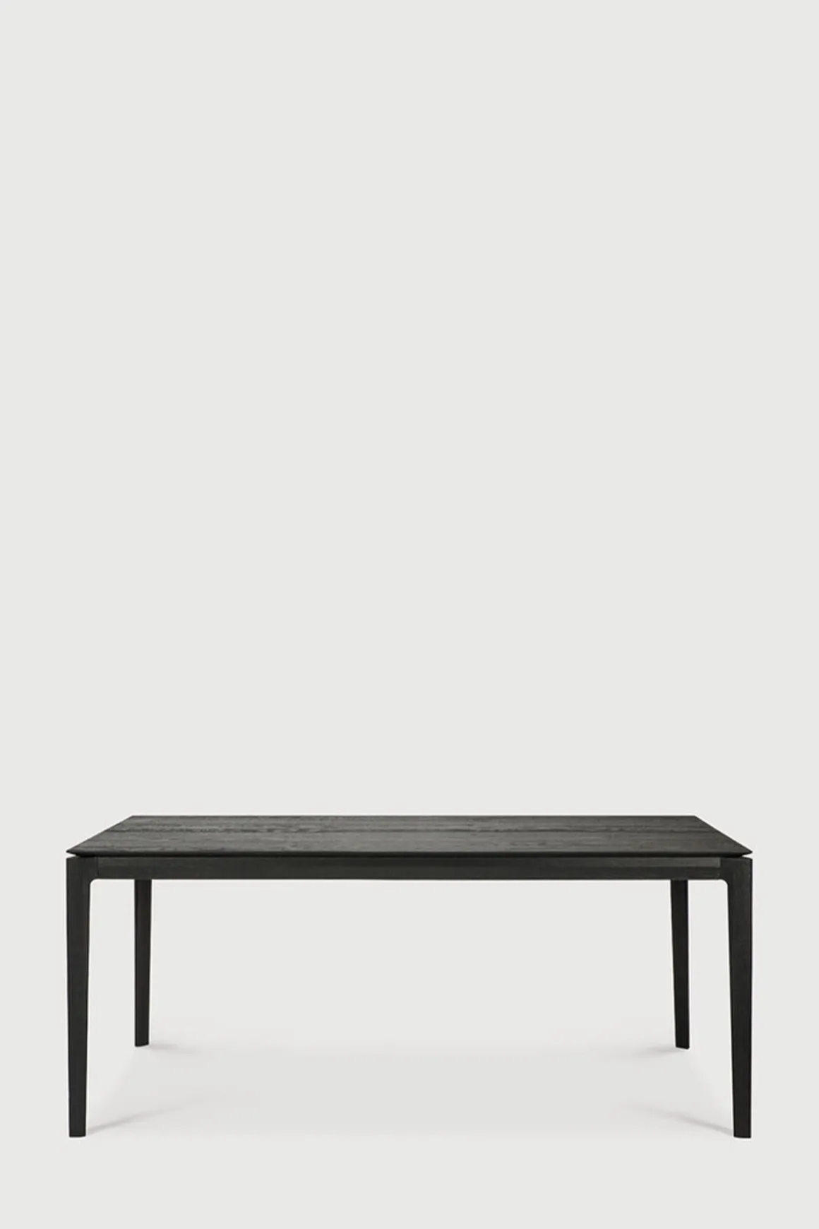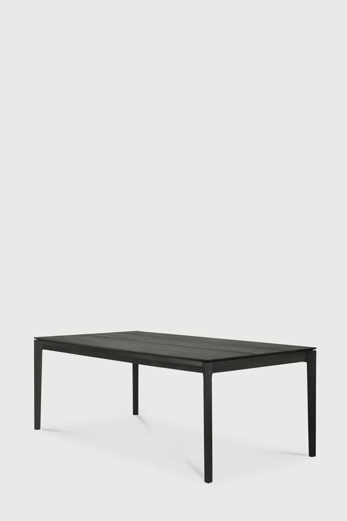 Bok spisebord i solid, sortlakkert eik med ileggsplate fra belgiske Ethnicraft, designet av Alain van Havre. Det forlengbare bordet måler 180cm og 280cm med ileggsplaten, perfekt hvis du har flere til bords en dag. Bordet har et luftig og minimalistisk uttrykk med en solid konstruksjon. Designet er enkelt, med komplekse detaljer som gjør det tidløst og personlig. Ethnicraft har fokus på å bruke europeisk eik i høy kvalitet og lar materiale komme til sin rett ved å beholde de naturlige varisasjonene og teksturene i treet. Dette er et bord du kan glede deg over i mange år fremover og som vil passe i alle hjem.