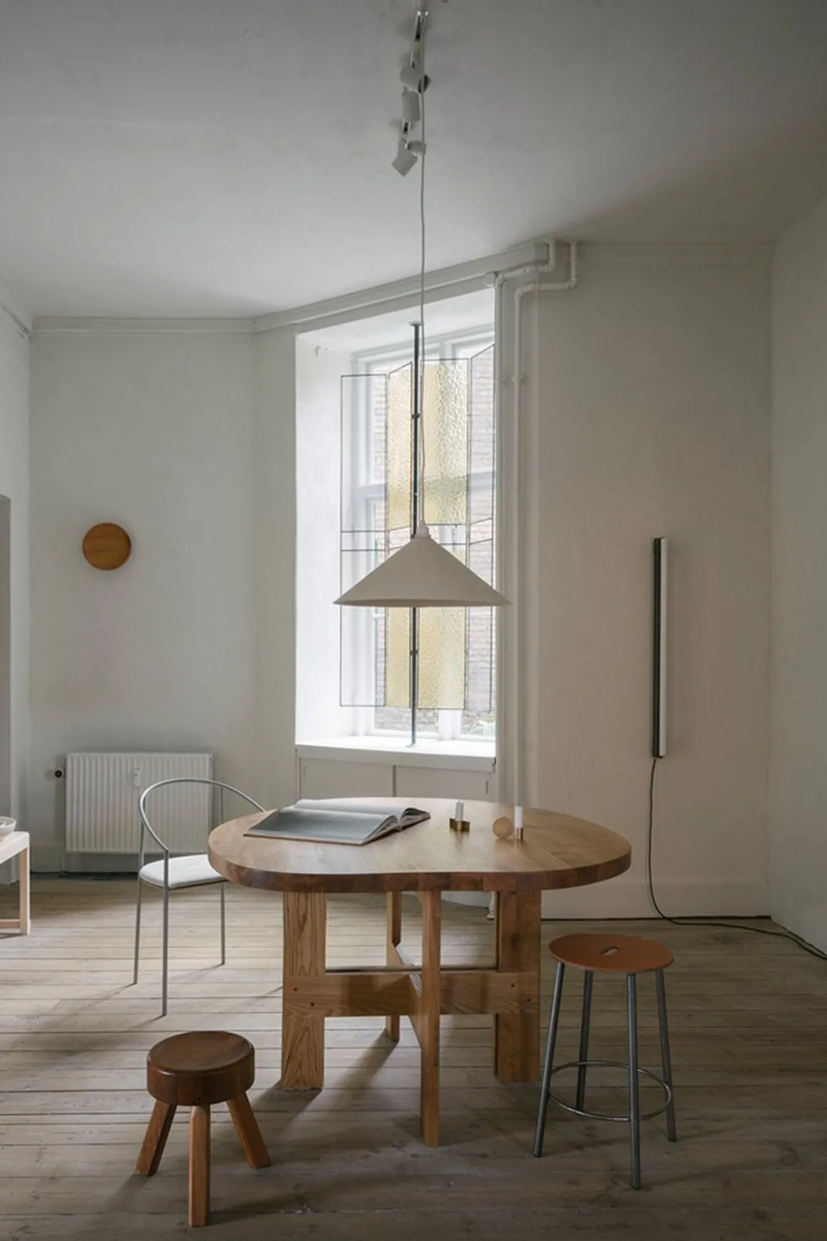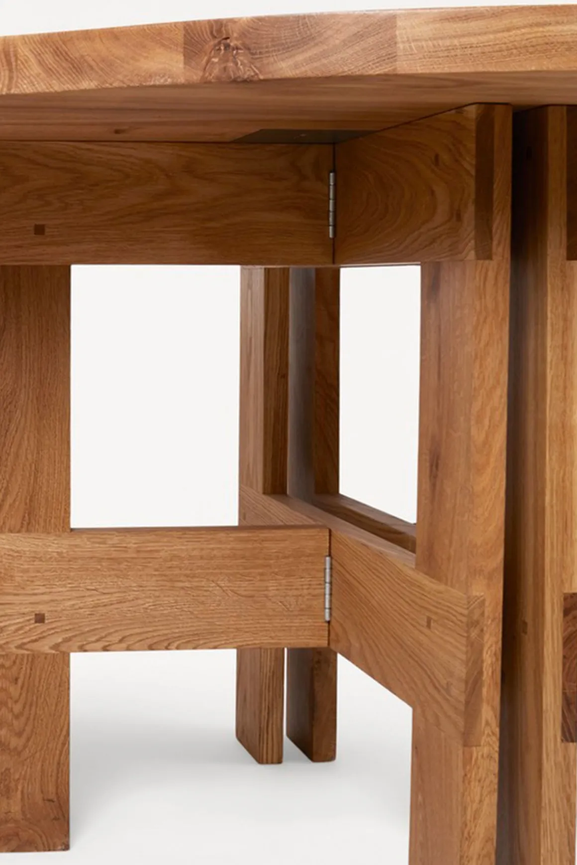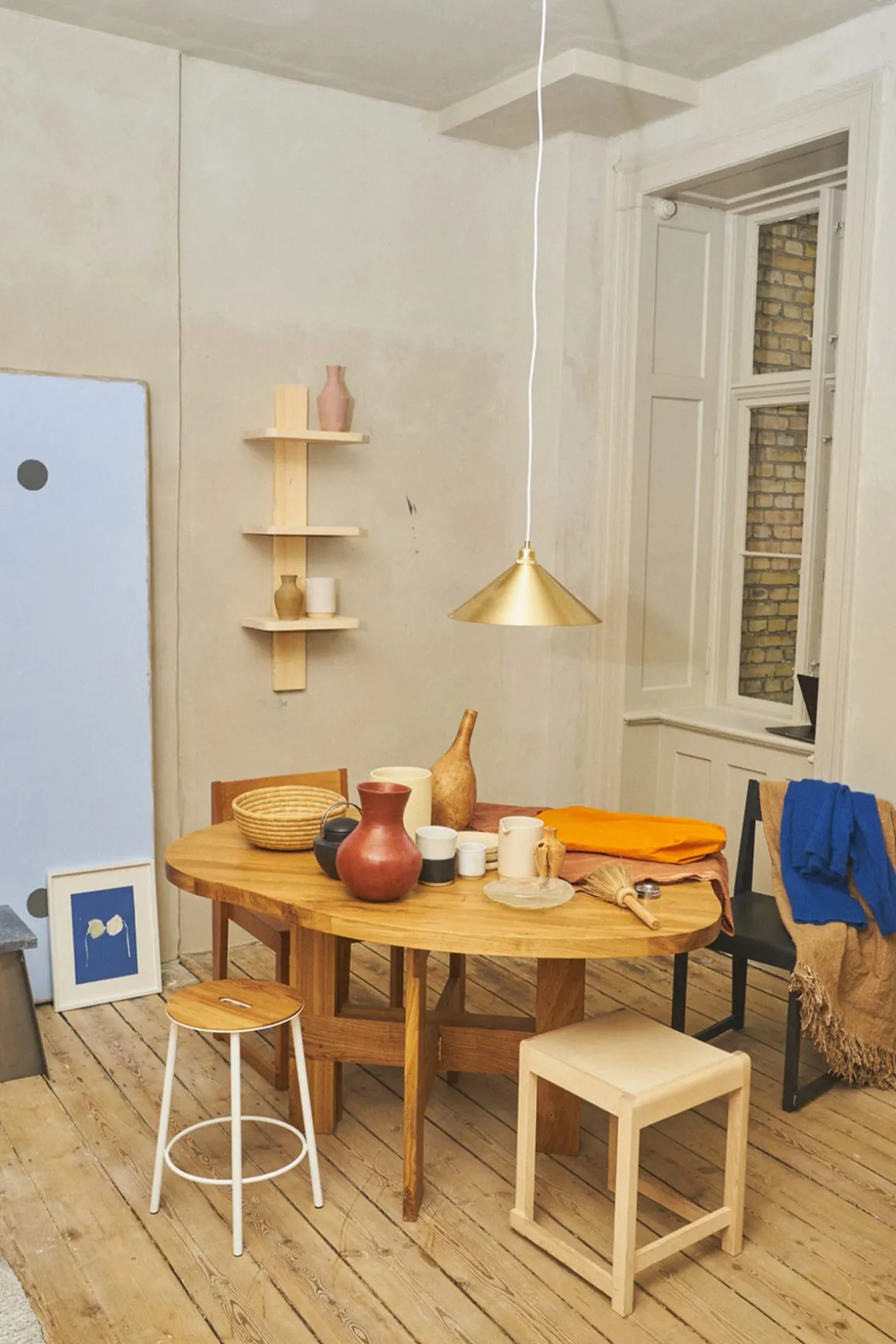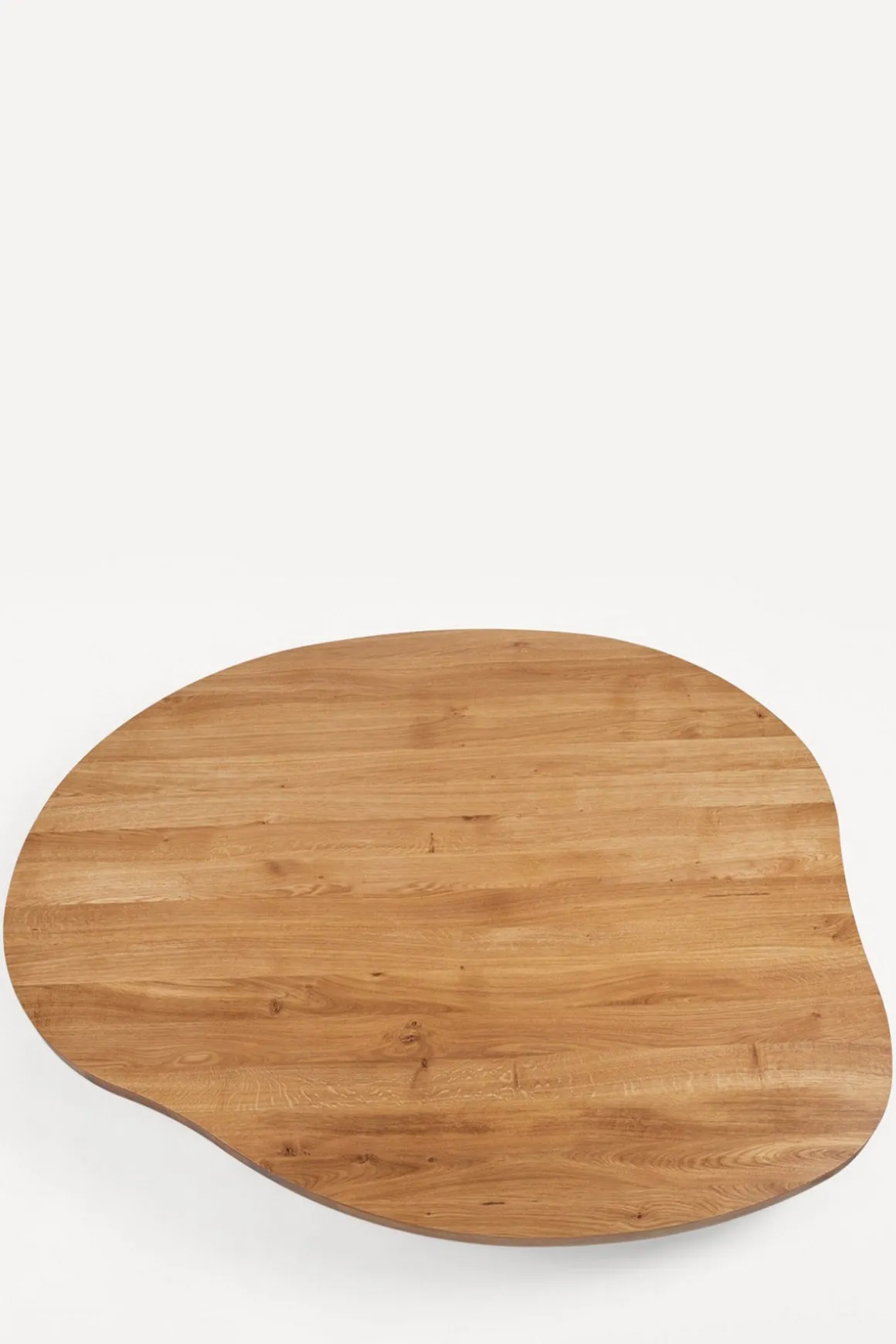 Table Pond spisebord fra Framas Farmhouse Dining Series. Den skulpturelle bordplaten har en organisk form med flytende linjer. Farmhouse-bordet er sammensatt av to bukker som ligner de synlige bjelkene som sees på tradisjonelle gårdshus. På toppen hviler en solid bordplate av eik. Bukkene kan også brukes til andre bordplater enn den som følger med om man ønsker det. Farmhouse Table passer perfekt med 4 stoler rundt bordet og kan brukes både som spisebord eller skrivebord. Bordet kommer flatpakket og er enkel å montere og flytte rundt.