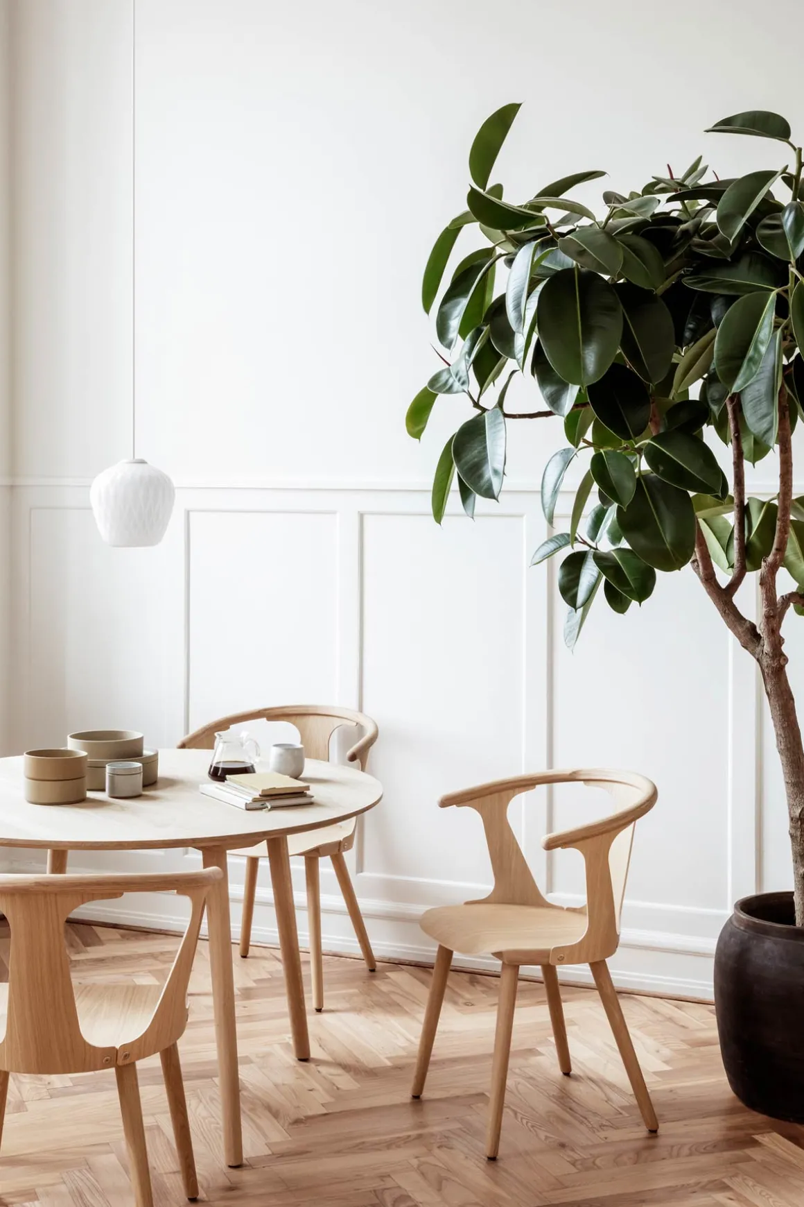SK4 In Between spisebord, designet av finske Sami Kallio for u0026amp;Tradition. Inspirert av den skandinaviske arven innen design og møbelhåndverk, er In Between et resultat av Sami Kallios solide forankring i tradisjonelle håndverksteknikker og hans øye for geniale detaljer. Det startet med en enkelt stol som senere resulterte i en serie møbler inkludert både bord og barkrakker. Bordet er laget av solid oljet eller lakkert tre og kommer i tre forskjellige varianter. Man kan velge mellom finish i oljet eik, røkt oljet eik, sort lakkert eik eller oljet valnøtt.