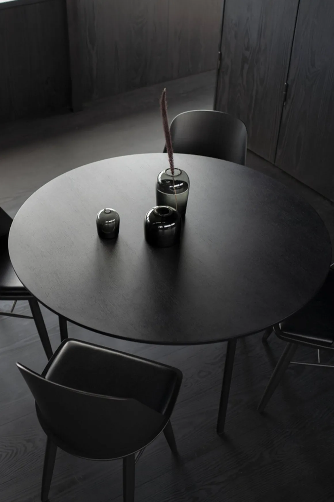 Snaregade rundt spisebord i en mørkegrå farge, med bordplate i linoleum og ben i sort, pulverlakkert stål. Snaregade er designet av Norm Architects og ble opprinnelig designet til Audo Copenhagens grunnlegger Bjarne Hansens private hjem. Han trengte et bord som hadde effektiv plassbruk, var visuelt lett og selvfølgelig sofistikert. Bordet ble så godt mottatt at det har vært i produksjon siden, og kommer i flere varianter, størrelser og farger. Snaregade er et klassisk og minimalistisk bord med en sterk geometrisk tilstedeværelse. Bordet er klassisk nok til å heve enhver plass estetisk, og er samtidig stødig og holdbart nok for både kommersiell og privat bruk. Dette er et praktisk og vakkert bord med god plass til 4-5 personer rundt, til hverdags eller spesielle anledninger.