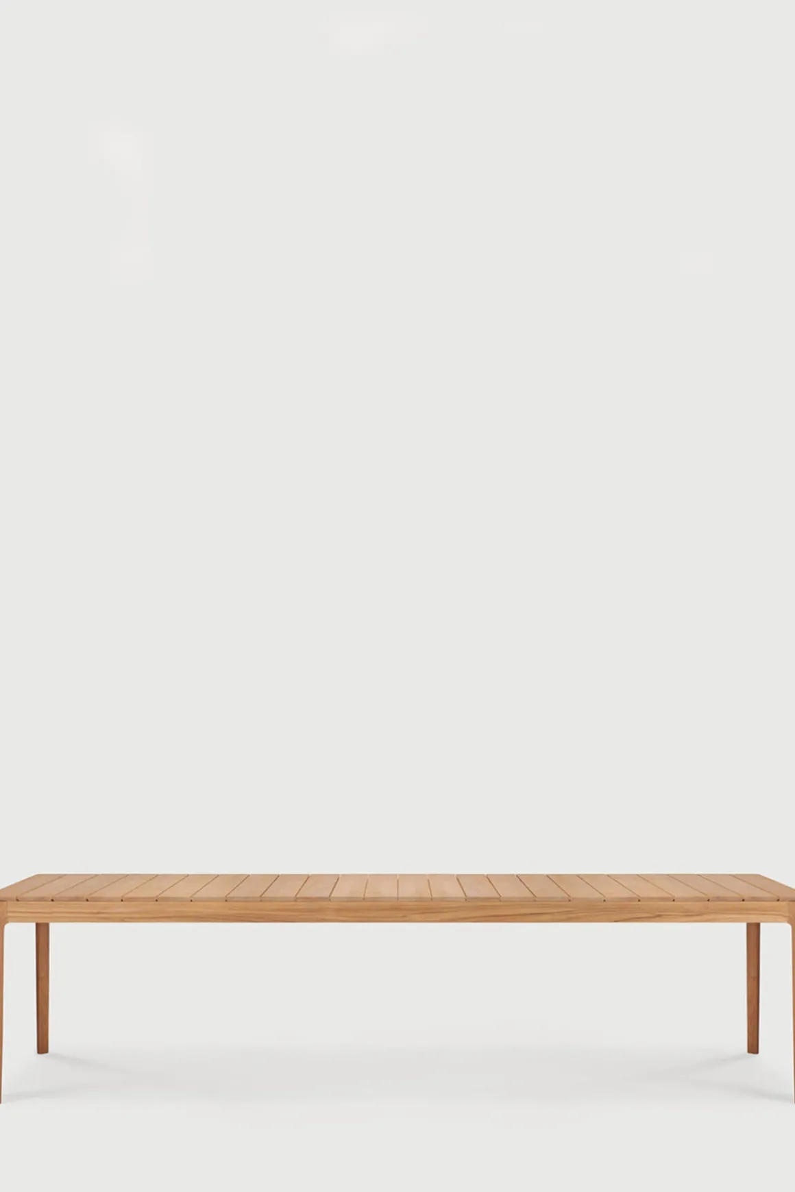 Spisebord i teak for utebruk fra belgiske Ethnicraft. Bordet er romslig, med god plass til 12, og har et luftig og minimalistisk uttrykk med rillet bordplate og solid konstruksjon. Designet er enkelt, men med komplekse detaljer som gjør det til en tidløs favoritt og en klassiker hos Ethnicraft. Ethnicraft har fokus på å bruke europeisk tre i høy kvalitet og lar materialet komme til sin rett ved å beholde de naturlige varisasjonene og teksturene i treet. Dette er et bord du kan glede deg over i mange år fremover og som vil passe til alle uterom, hjemme eller på hytta.