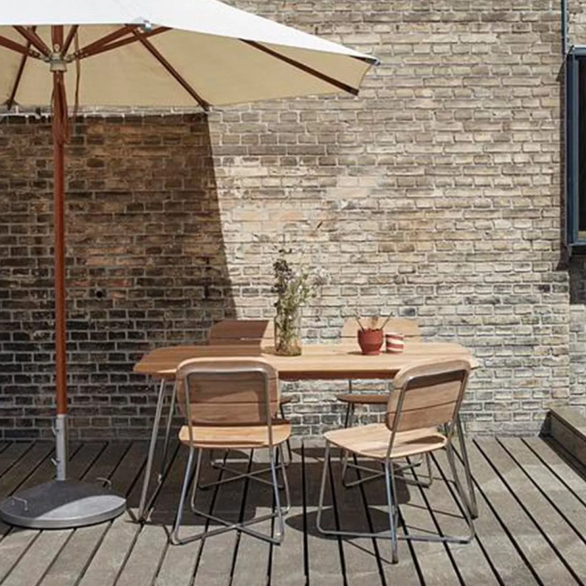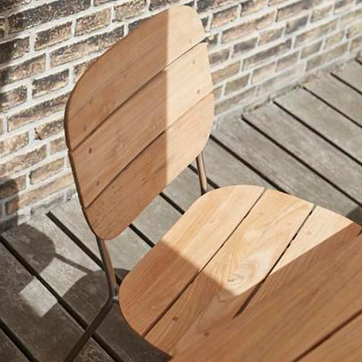 Lilium-utestol fra Skagerak. Denne stolen har en behagelig og litt bredere form enn en vanlig spisestol, spesielt designet med tanke på å motstå all slags vær. Setet og ryggstøtten er laget av solid teak, med en X-formet base av rustfritt stål. Moderne og klassisk på samme tid, perfekt i hagen, på terrassen eller balkongen. Lilium-serien har også matchende bord og benk, og det finnes sitteputer i flere farger spesielt tilpasset denne stolen. Over tid vil treet patinere og få den sølvgrå fargen mange er så glad i, men stolen kan også behandles for å bevare den originale fargen.