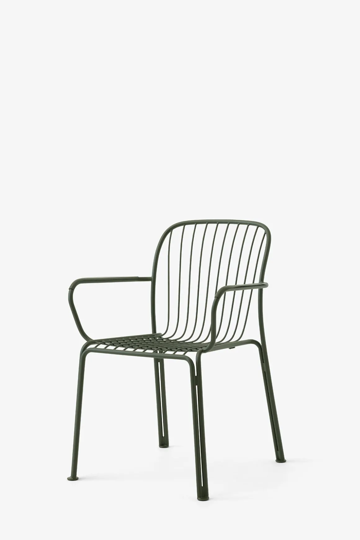 Thorvald utestol med armlener fra danske u0026amp;Tradition, designet av anerkjente Space Copenhagen. Thorvald er laget av pulverlakkert stål og kommer i sort, grønn og elfenbenshvit. Stolens ramme og spilene er bøyd og delene blir deretter sveiset, polert, galvanisert og deretter pulverlakkert. Thorvald kan kombineres med andre typer utemøbler eller du kan komplettere med bord i samme serie for en komplett look til uteplassen. Stolene kan også enkelt stables som gjør de svært praktiske og plassbesparende når de ikke er i bruk.
