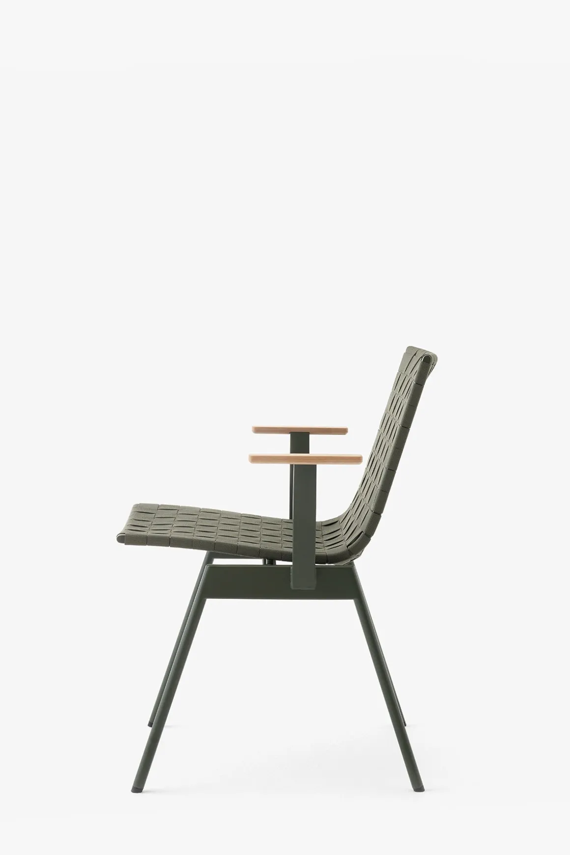 Ville AV34 utestol med armlener fra danske u0026amp;Tradition, designet av den norske designduoen Andersen u0026amp; Voll. Ville er laget av pulverlakkert stål med vevde polyesterremser i sete og rygg og armlener i teak. Metallet kuttes, formes, sveises og deretter pulverlakkeres, mens remsene til stolsetet er vevd for hånd og kuttet i form med en varm kniv for å unngå frynsing. Stolen finnes i sort eller grønn og kommer med eller uten armlener. Ville kan enkelt kombineres med andre typer utemøbler eller du kan komplettere med bord i samme serie for en helhetlig look til uteplassen. Stolene kan stables i hverandre som er veldig praktisk og plassbesparende når de ikke er i bruk.