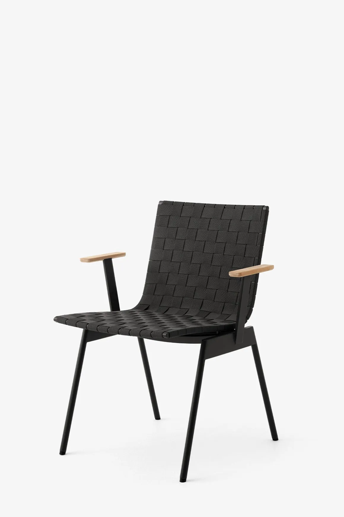 Ville AV34 utestol med armlener fra danske u0026amp;Tradition, designet av den norske designduoen Andersen u0026amp; Voll. Ville er laget av pulverlakkert stål med vevde polyesterremser i sete og rygg og armlener i teak. Metallet kuttes, formes, sveises og deretter pulverlakkeres, mens remsene til stolsetet er vevd for hånd og kuttet i form med en varm kniv for å unngå frynsing. Stolen finnes i sort eller grønn og kommer med eller uten armlener. Ville kan enkelt kombineres med andre typer utemøbler eller du kan komplettere med bord i samme serie for en helhetlig look til uteplassen. Stolene kan stables i hverandre som er veldig praktisk og plassbesparende når de ikke er i bruk.