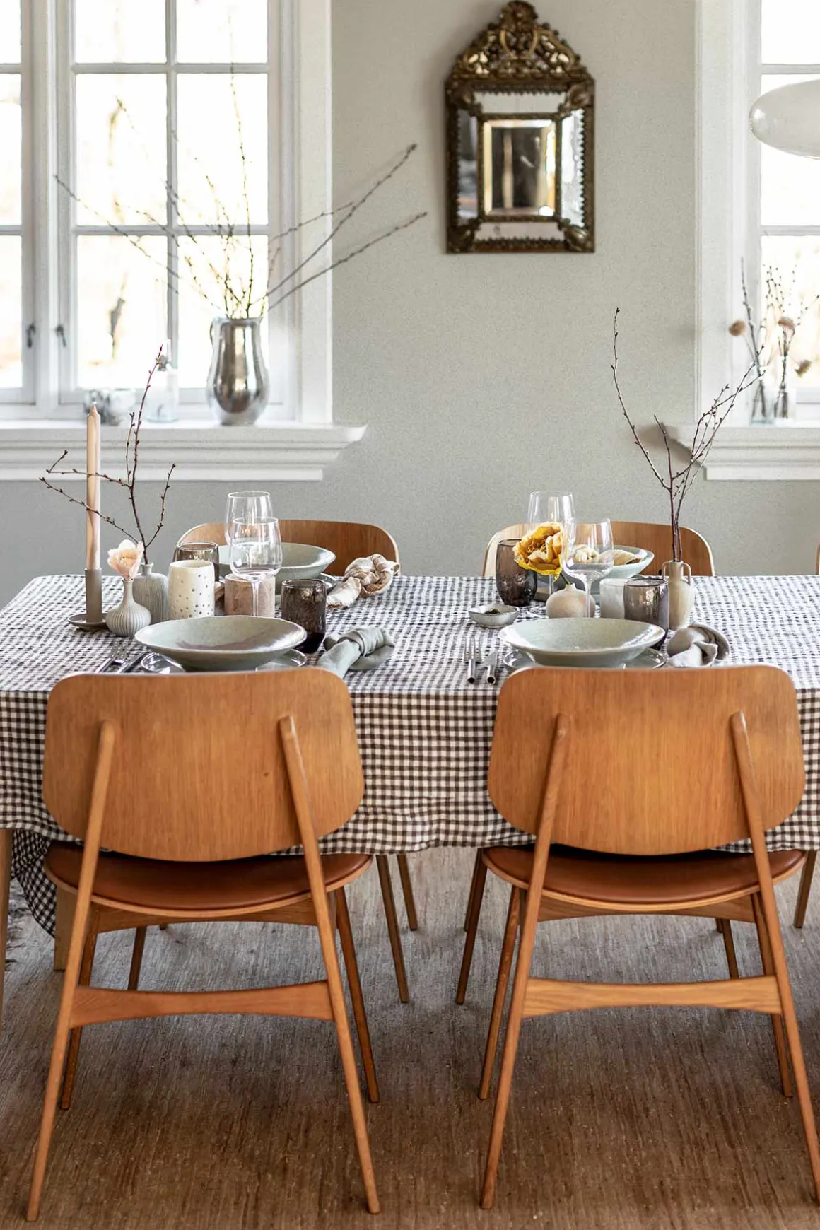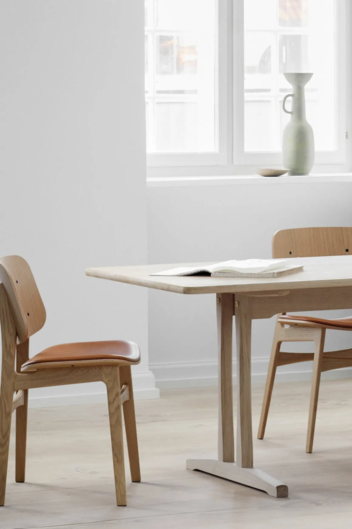 Liker du dansk design, vil du elske denne klassikeren som ble designet av Børge Mogensen i 1950. Søborg Model 3051 kommer i lakkert eik med polstret sete i cognacfarget skinn. Med Søborgstolen greide Mogensen å kombinere snekkertradisjoner i massivt tre med moderne, formspent finér. Stolrammen er av heltre eik, med sete og rygg av formpresset kryssfinér. Seteputen er utskiftbar og trukket i CMHR eller HR-skum med trekk i stoff eller skinn. Søborg-stolen er en behagelig stol med sjenerøse proporsjoner i sete og rygg, som fås med eller uten polstring. De avrundede formene og polstringen i setet gir stolen ekstra god sittekomfort – perfekt til lange frokoster og middager. Søborg-stolen har utskiftbare komponenter som kan fornyes separat etter behov. Hvis du ønsker mer informasjon om stolen eller vil se på stoff-eller skinnprøver, så ta turen innom butikken – vi hjelper deg gjerne!
