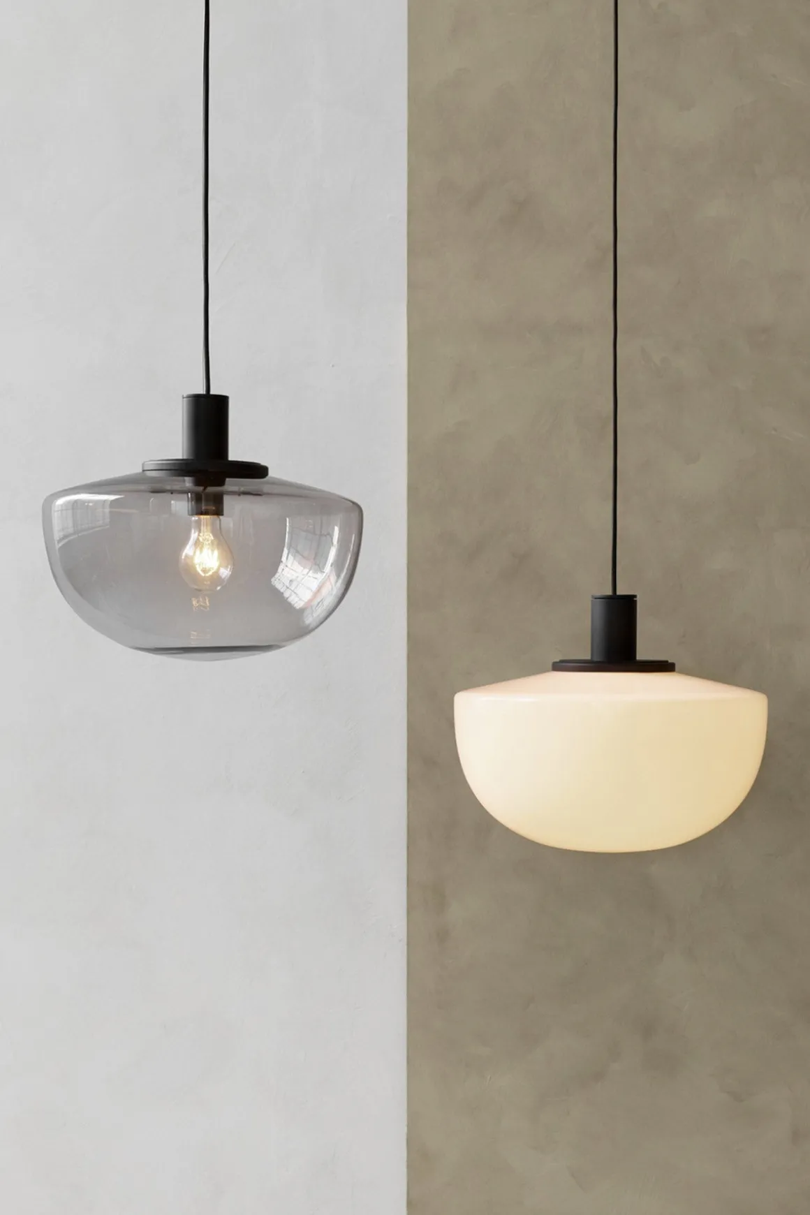 Bank Pendant taklampe, designet av Norm Architects. Lampen fås i opalglass eller grått, munnblåst glass med base av sort, anodisert aluminium. Det matte glasset gir et jevnt 360-grader lys, som tilfører en behagelig atmosfære. Bank har et tidløst, solid design og enkelt formspråk som gjør lampen til en allsidig klassiker som kan brukes i mange rom. Heng den alene eller sammen med 2-3 andre over spisebordet, på kjøkkenet, på soverommet eller i gangen.