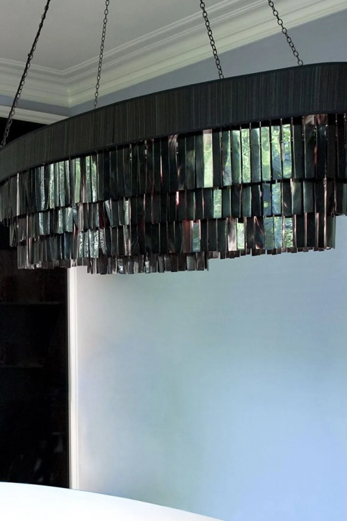 Bli kjente med den fantastiske lysekronen Eclipse Chandelier Oval fra Ochre. Lampeskjermen er laget av mørkt hestehår på burgunderrød base, med «dråper» i horn i mørk og lysere valør. Siden horn er et naturmateriale, vil noe variasjoner i farge og form forekomme og gjør samtidig lampen mer levende. Eclipse Chandelier Oval får du i 2 ulike størrelser (Dia: 120 cm eller 150 cm) i tillegg til en rund variant som kommer i 4 størrelser (Dia: 20/40/60/100 cm) samt en vegglampe. Eclipse Chandelier kommer med 4 justerbare kjettingvaiere i mørk bronse på opptil 2m lengde som er festet i takkoppen med bronse-finish. Et virkelig blikkfang som vil sette et unikt preg på interiøret.