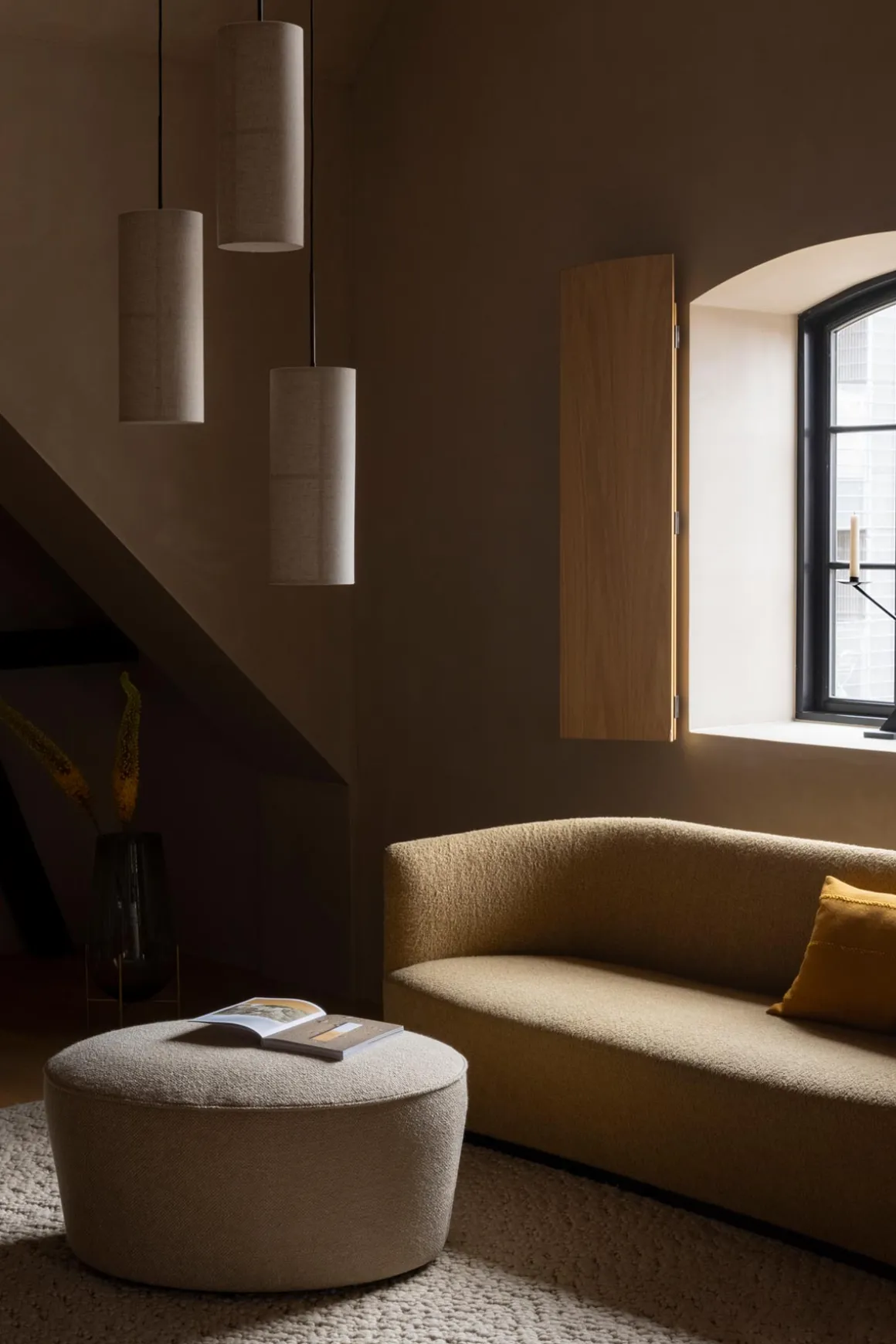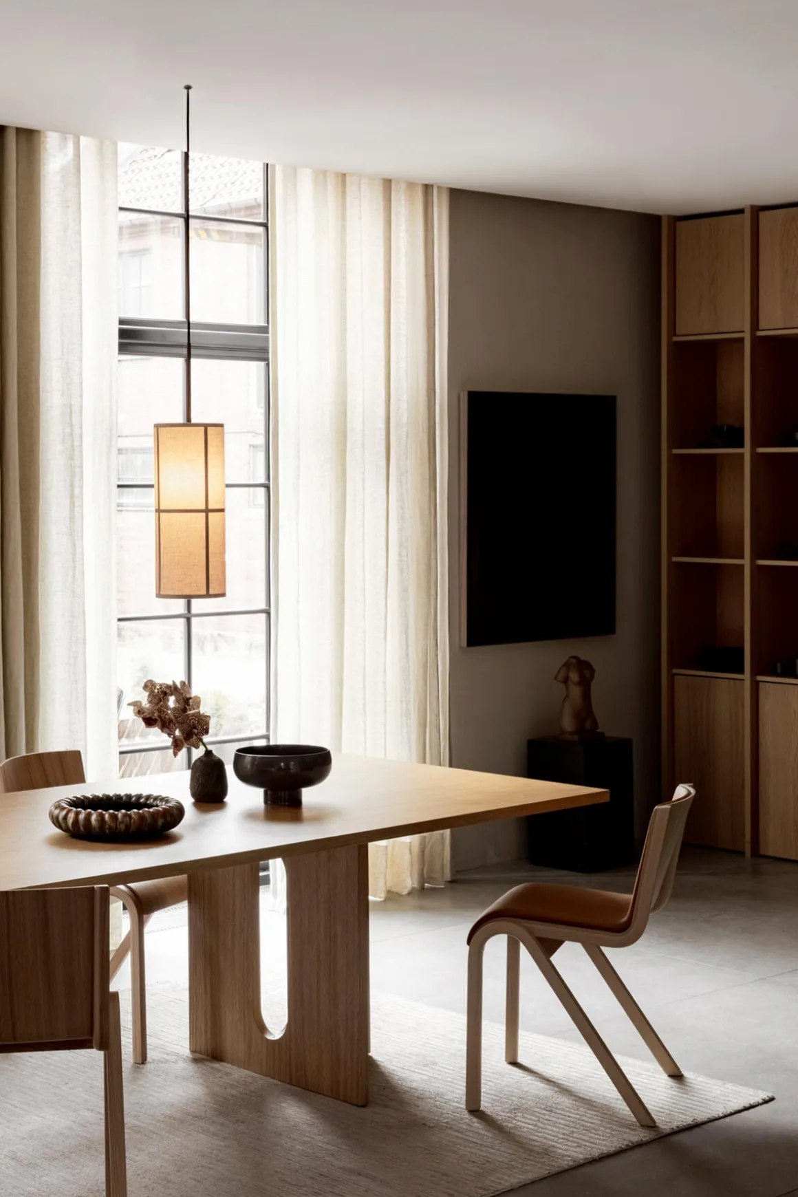 Hashira Pendant S taklampe med beige skjerm. Hashira-kolleksjonen er en moderne, nordisk vri på tradisjonelle, japanske rispapir lanterner. Hashira-lampen fyller rommet med et stemningsfylt og mykt lys, og det slanke designet med lampeskjerm av lin gir et beroligende uttrykk. Lampen henger på en sort justerbar tekstilledning, og blir et vakkert tilskudd over middagsbordet, i gangen eller på soverommet for eksempel. Like fin alene eller gruppert med flere lamper. Hashira kommer i to fargenyanser; hvit eller raw.