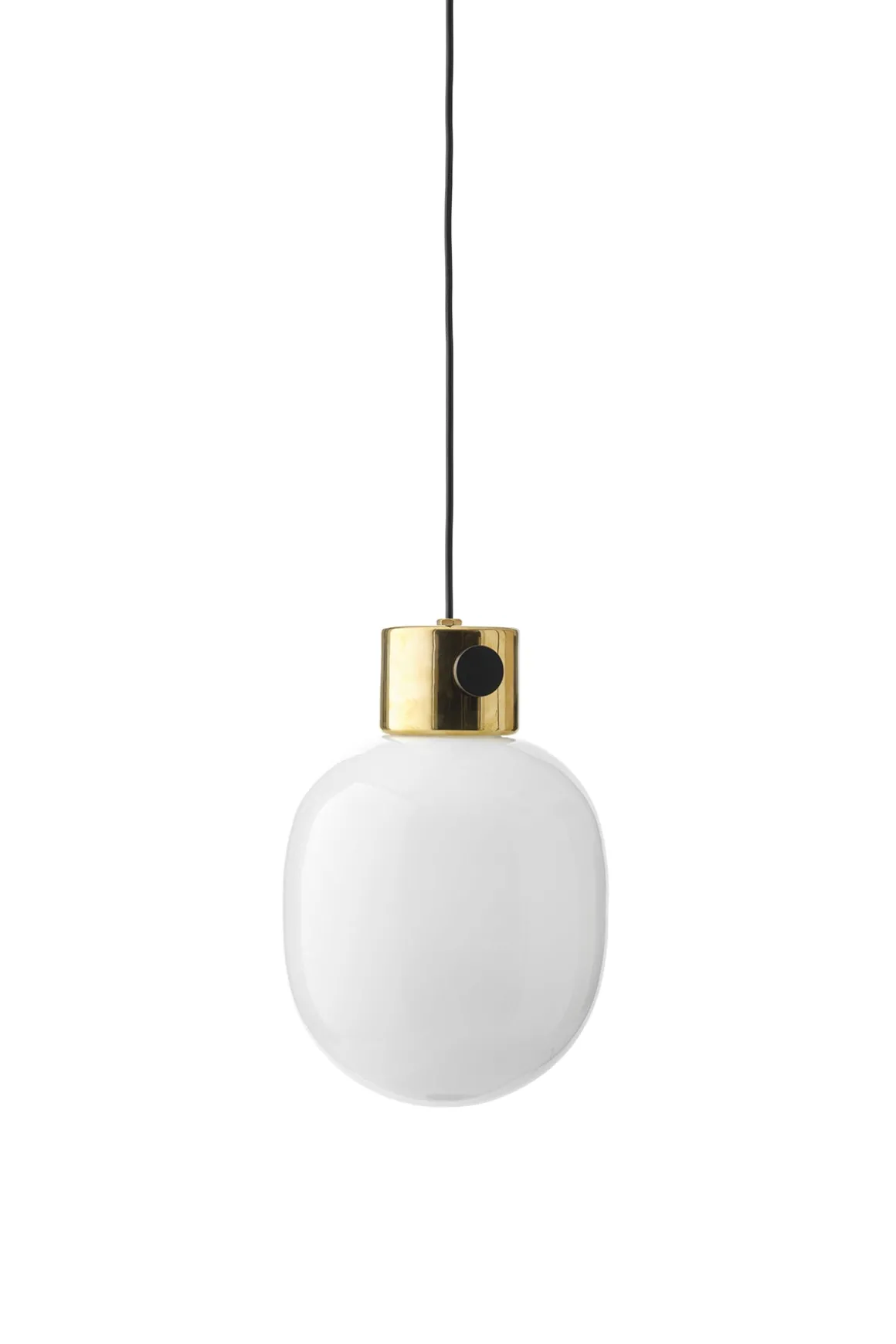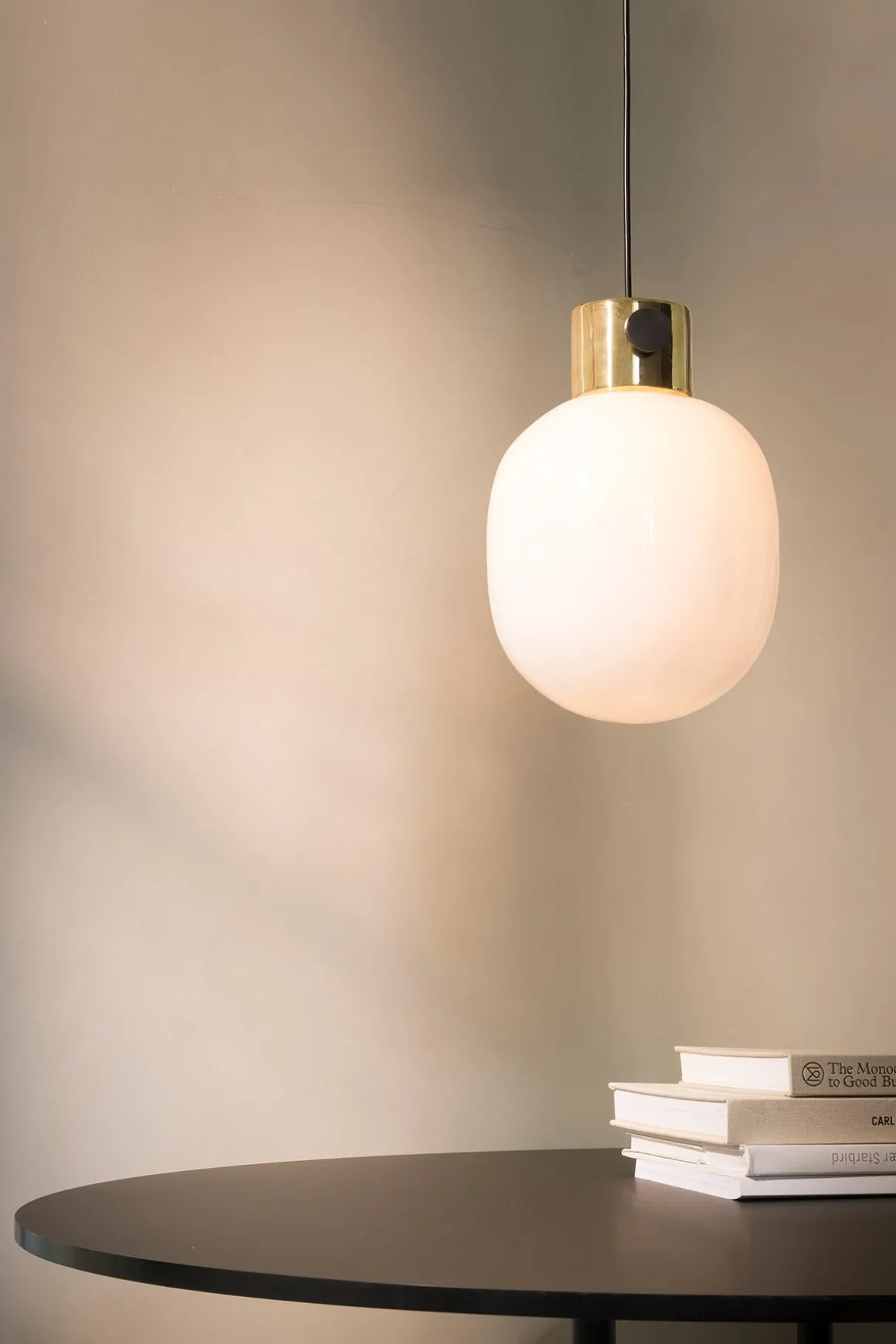 Stilfull og minimalistisk taklampe designet av Jonas Wagell bestående av en glasskuppel i opalglass og base av speilpolert messing. Lampen har en industriell bryter på basen i sort, mens den ovale kuppelen bidrar til et mykt lys som passer godt over spisebordet, kjøkkenøya eller stuebordet. Siden dimmeren sitter på basen av lampen, kan man fint justere styrken på lyset etter behov, uten å måtte reise seg. Den har en 4 meter lang, sort tekstilledning som følger med, lyspære er inkludert. Merk at messing vil utvikle naturlig patina over tid.